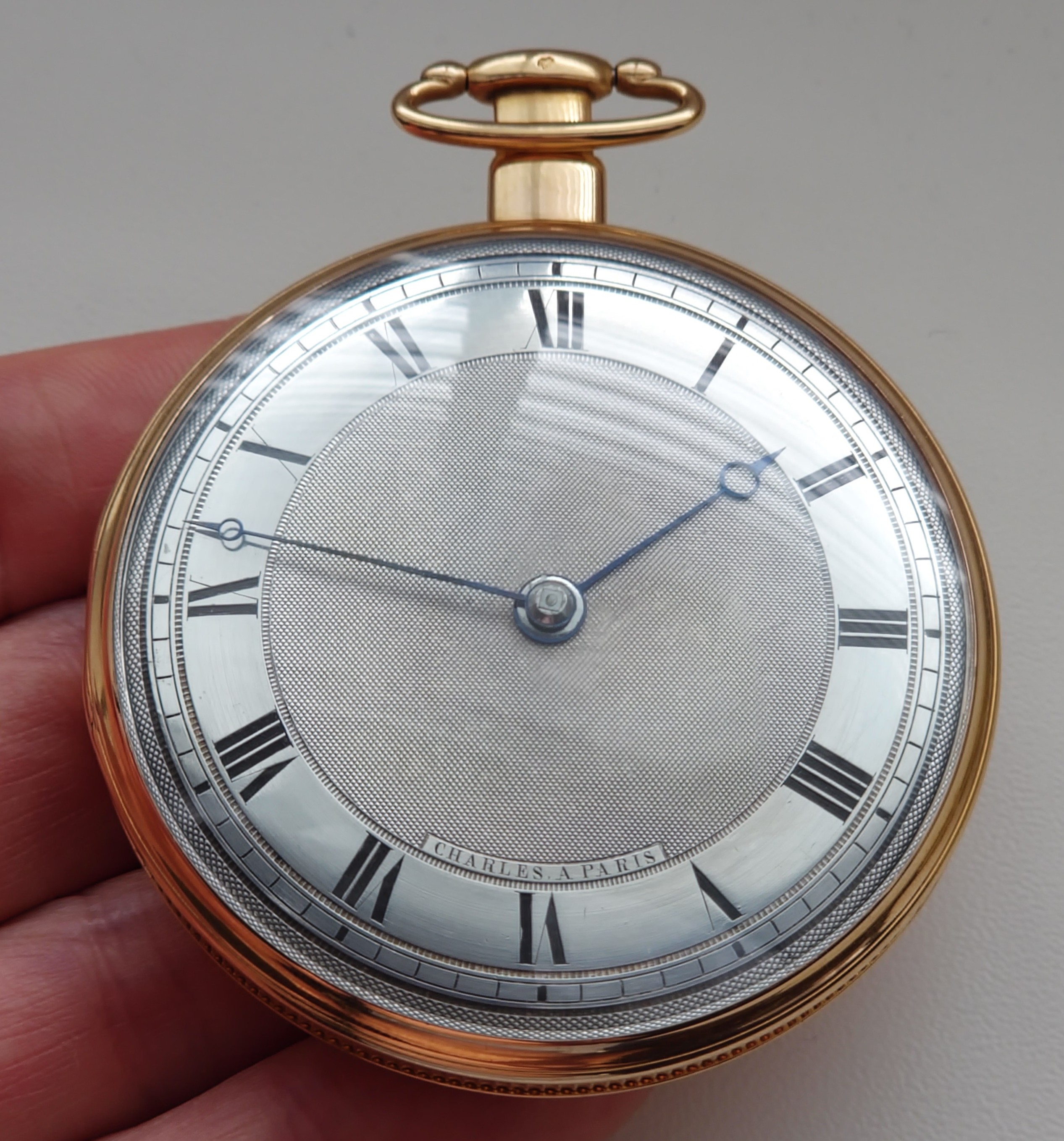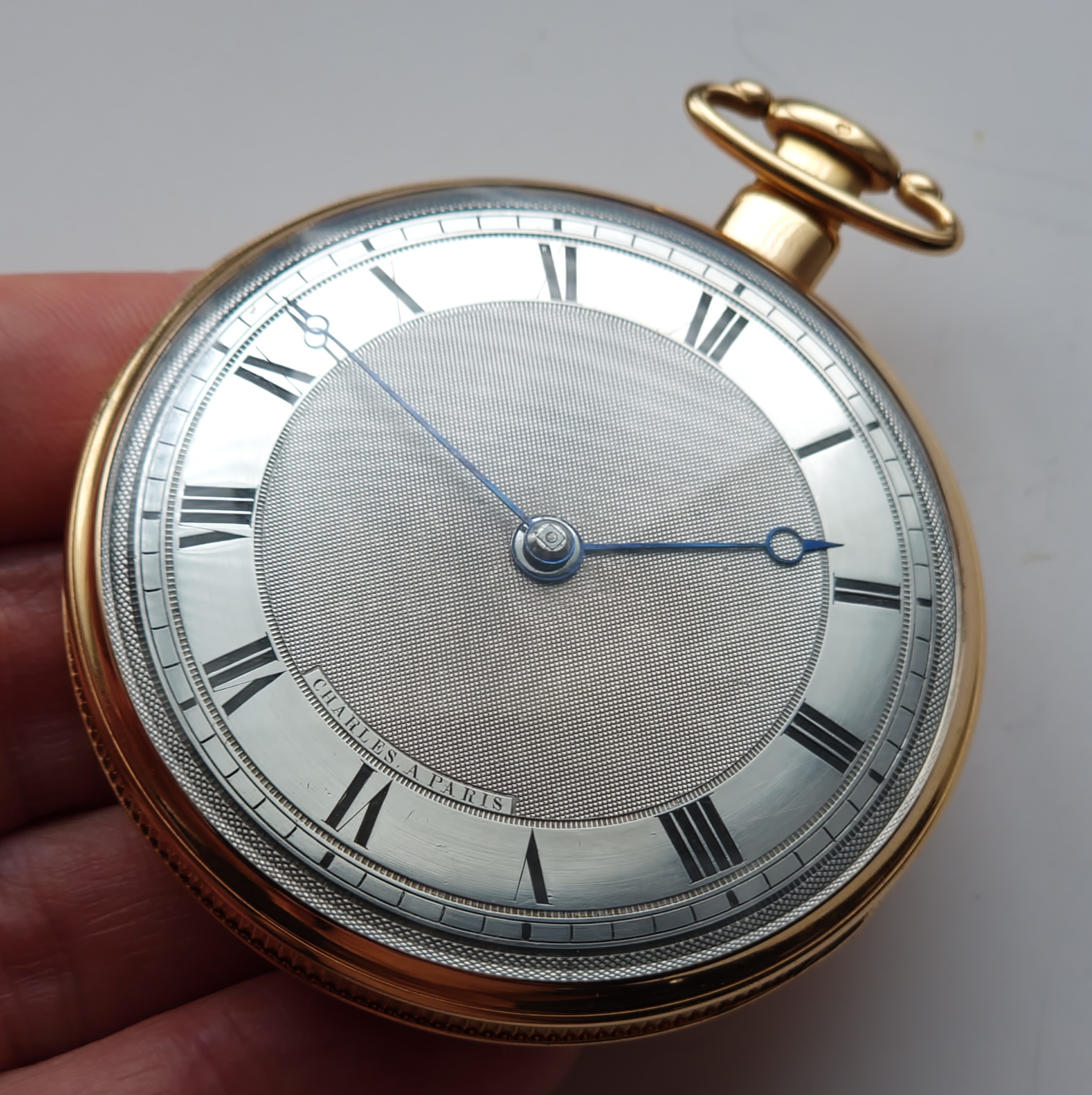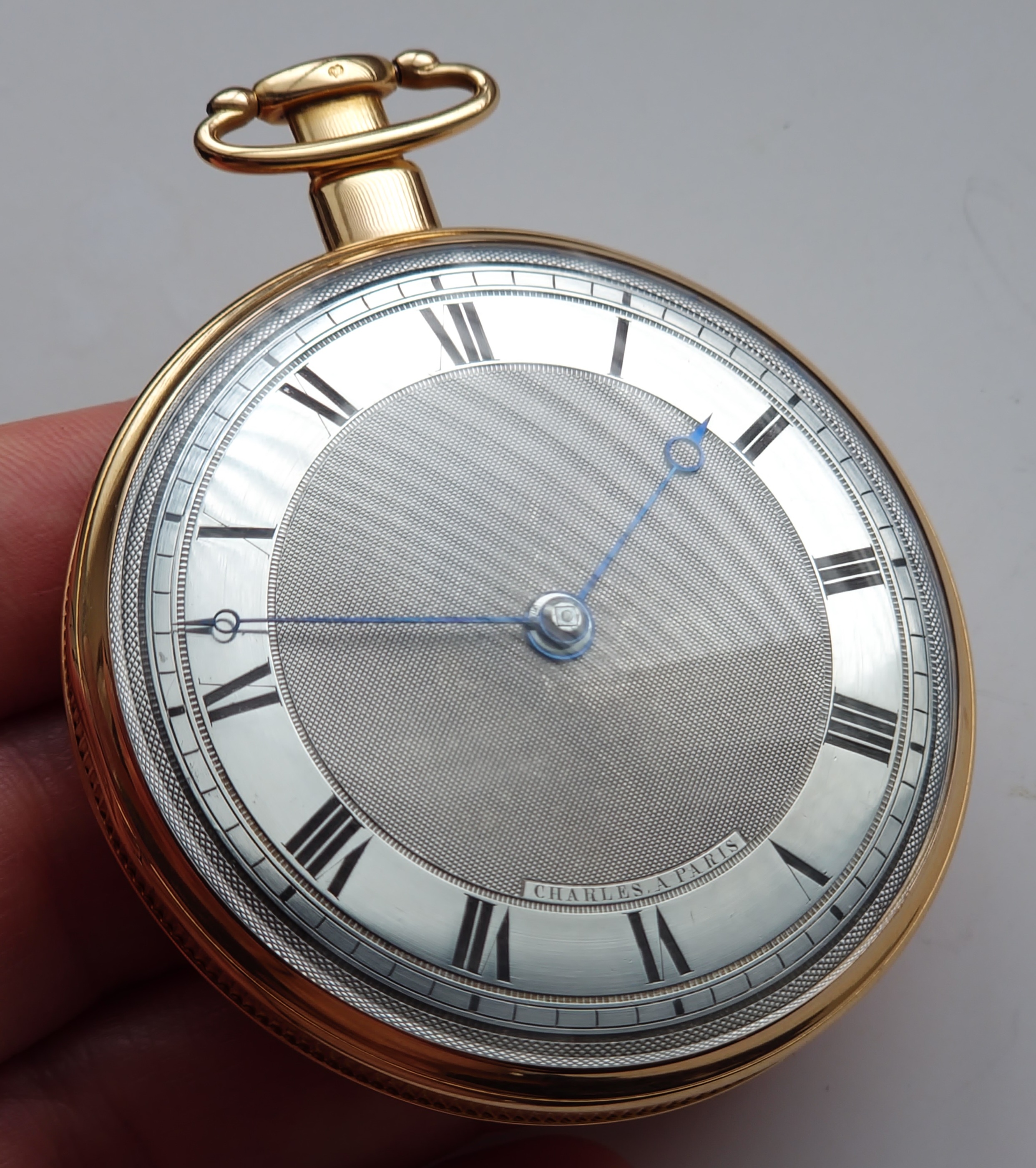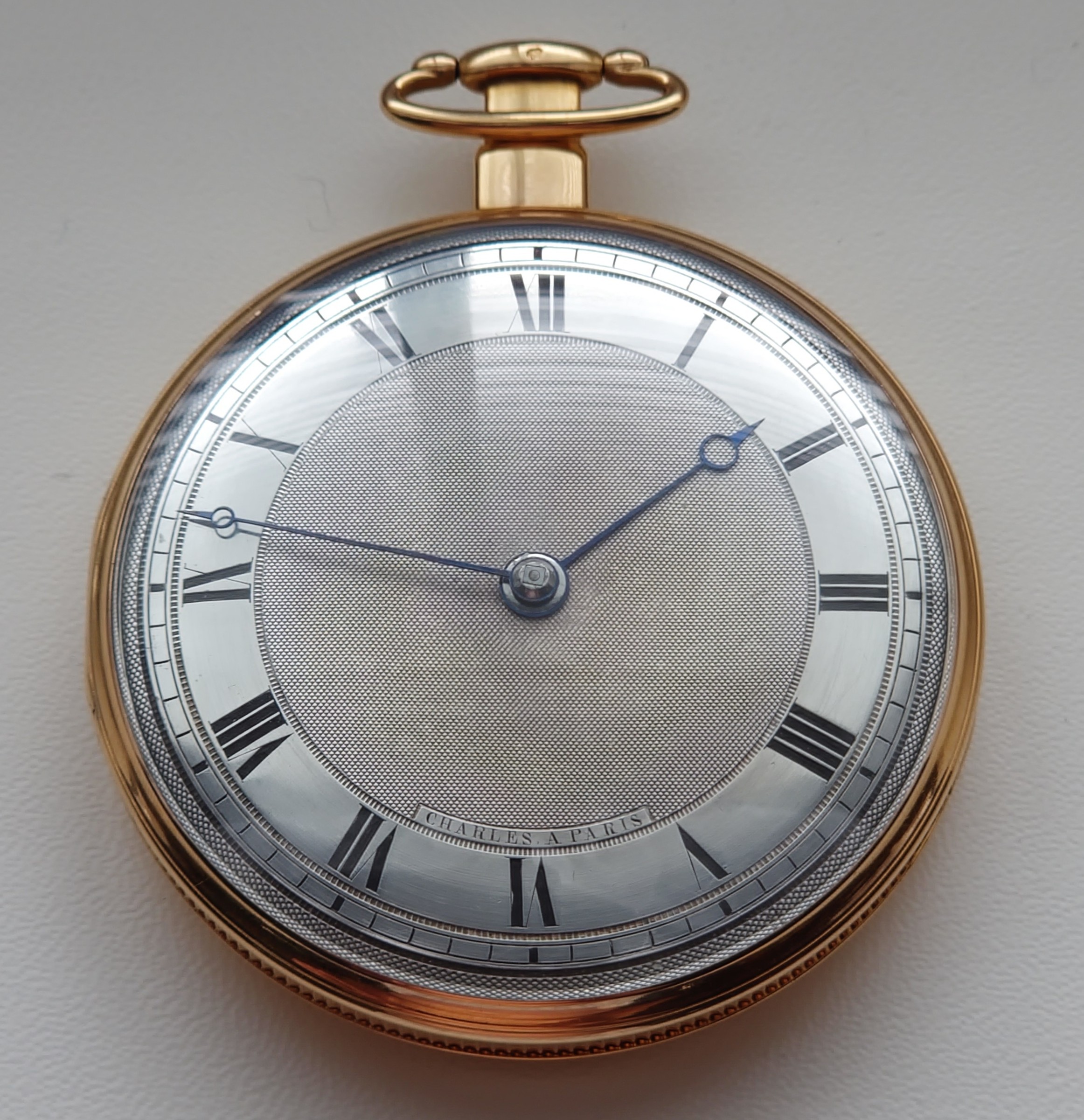 Pouzdro je velmi masivní a těžké, vyrobené z 18karátového zlata, s hladkou zadní plochou a jemně vroubkovaným (rádlovaným) bokem. Za pozornost stojí krásný, plochý a masivní zlatý krček. Průměr pouzdra činí Ø 60 mm, celková váha 134 g. Hodinky jsou signovány: CHARLES A PARIS.