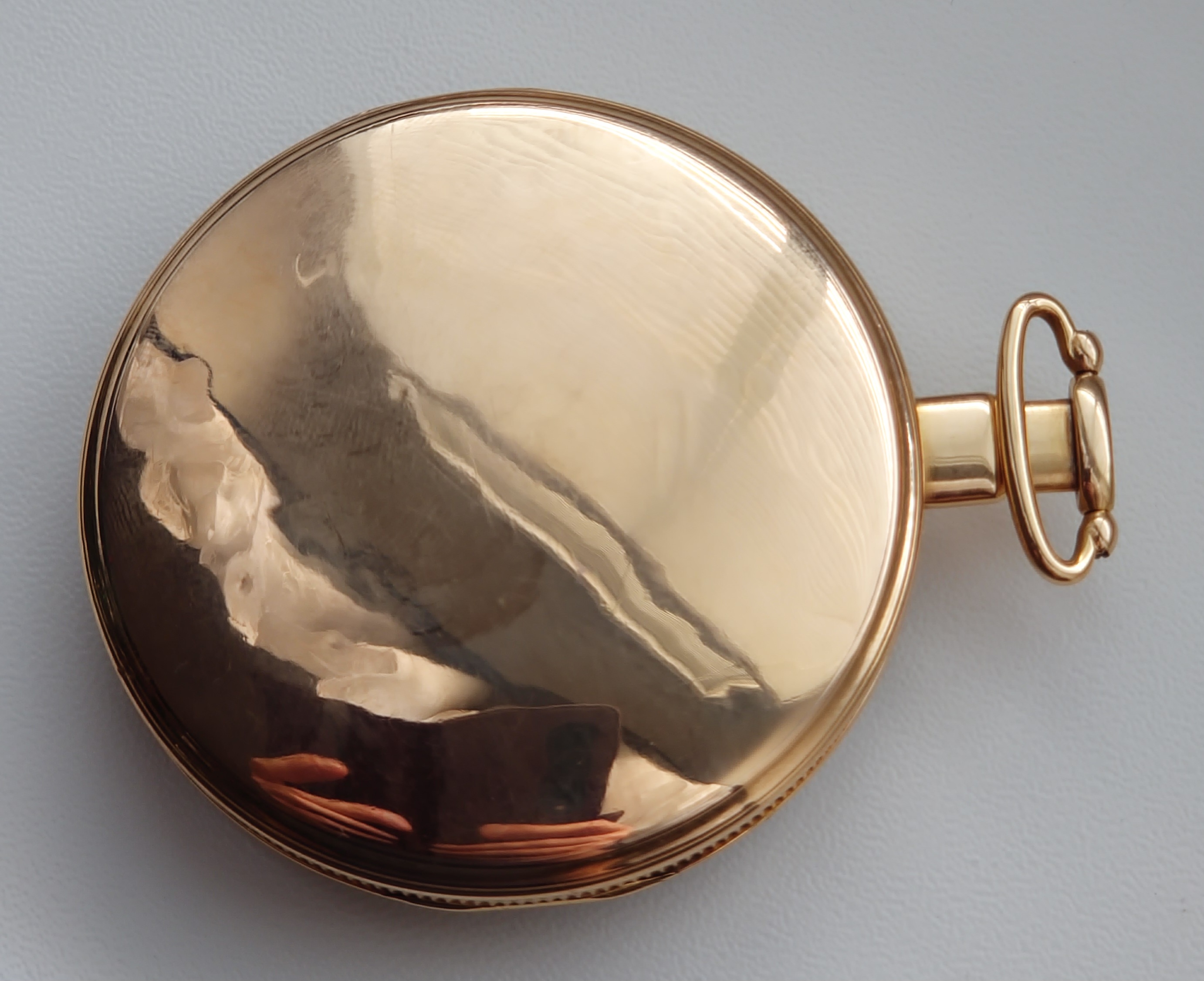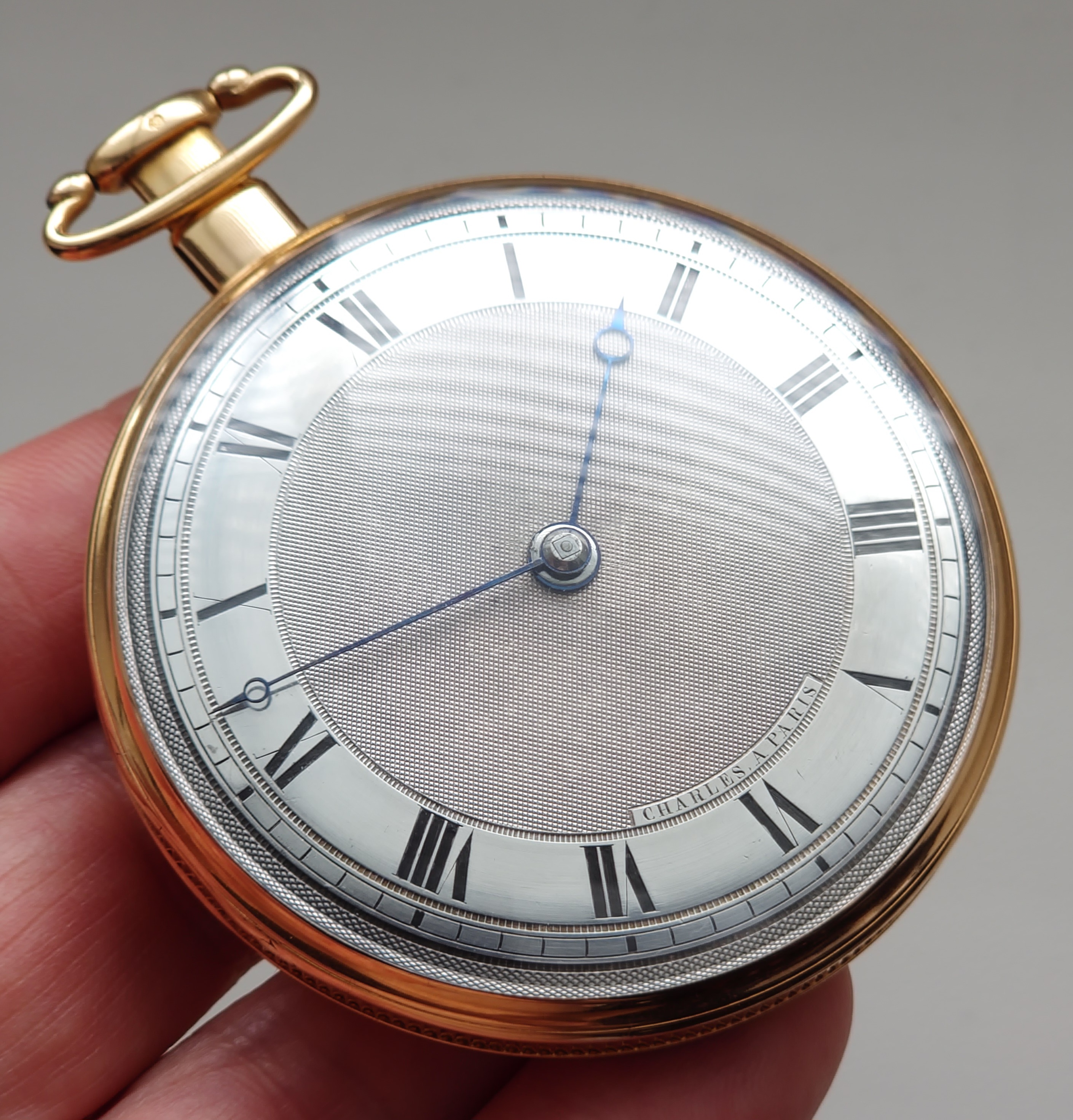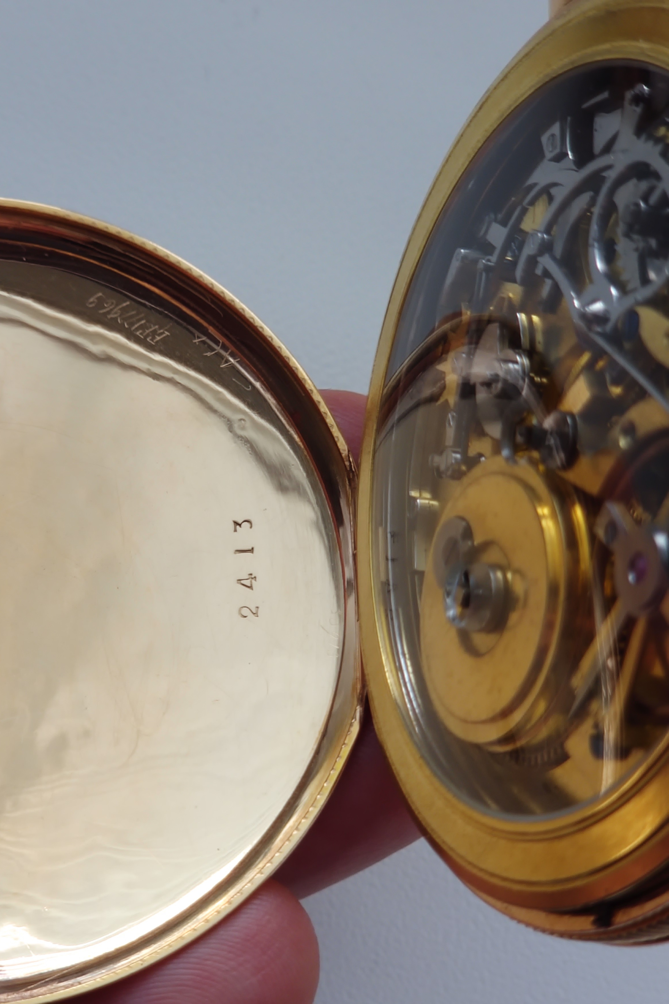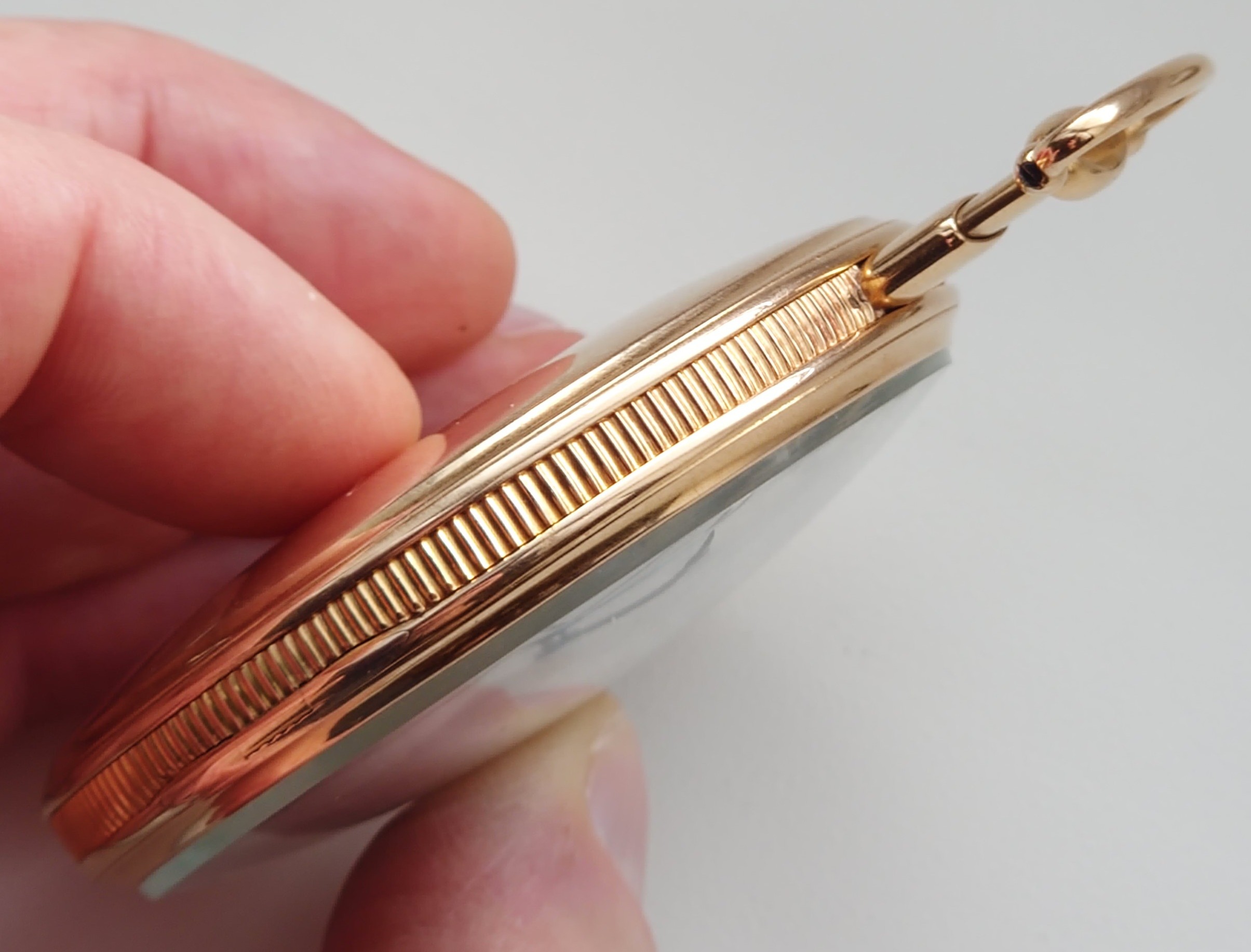 Pouzdro je velmi masivní a těžké, vyrobené z 18karátového zlata, s hladkou zadní plochou a jemně vroubkovaným (rádlovaným) bokem. Za pozornost stojí krásný, plochý a masivní zlatý krček. Průměr pouzdra činí Ø 60 mm, celková váha 134 g. Hodinky jsou signovány: CHARLES A PARIS.