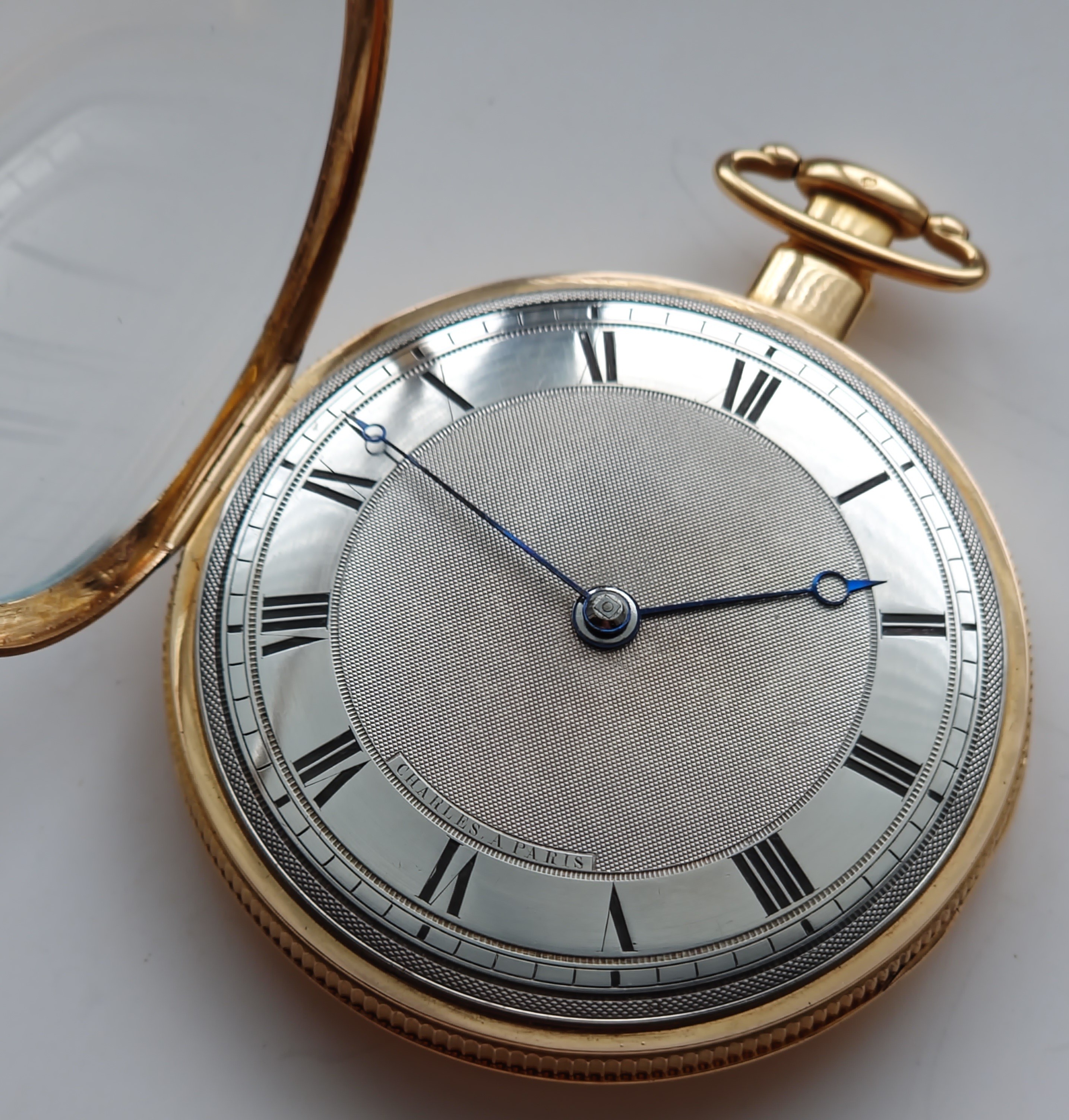 Číselník je typickým příkladem empírového stylu, s bohatě gilošovaným středem. Je masivní, silný a hluboce rytý. Stříbrná římská čísla jsou rytá do hloubky a vyplněná černou hmotou, rytá signatura CHARLES A PARIS je umístěna u čísla VI. Celek doplňují krásné empírové, ručně řezané a modřené ocelové ručičky.