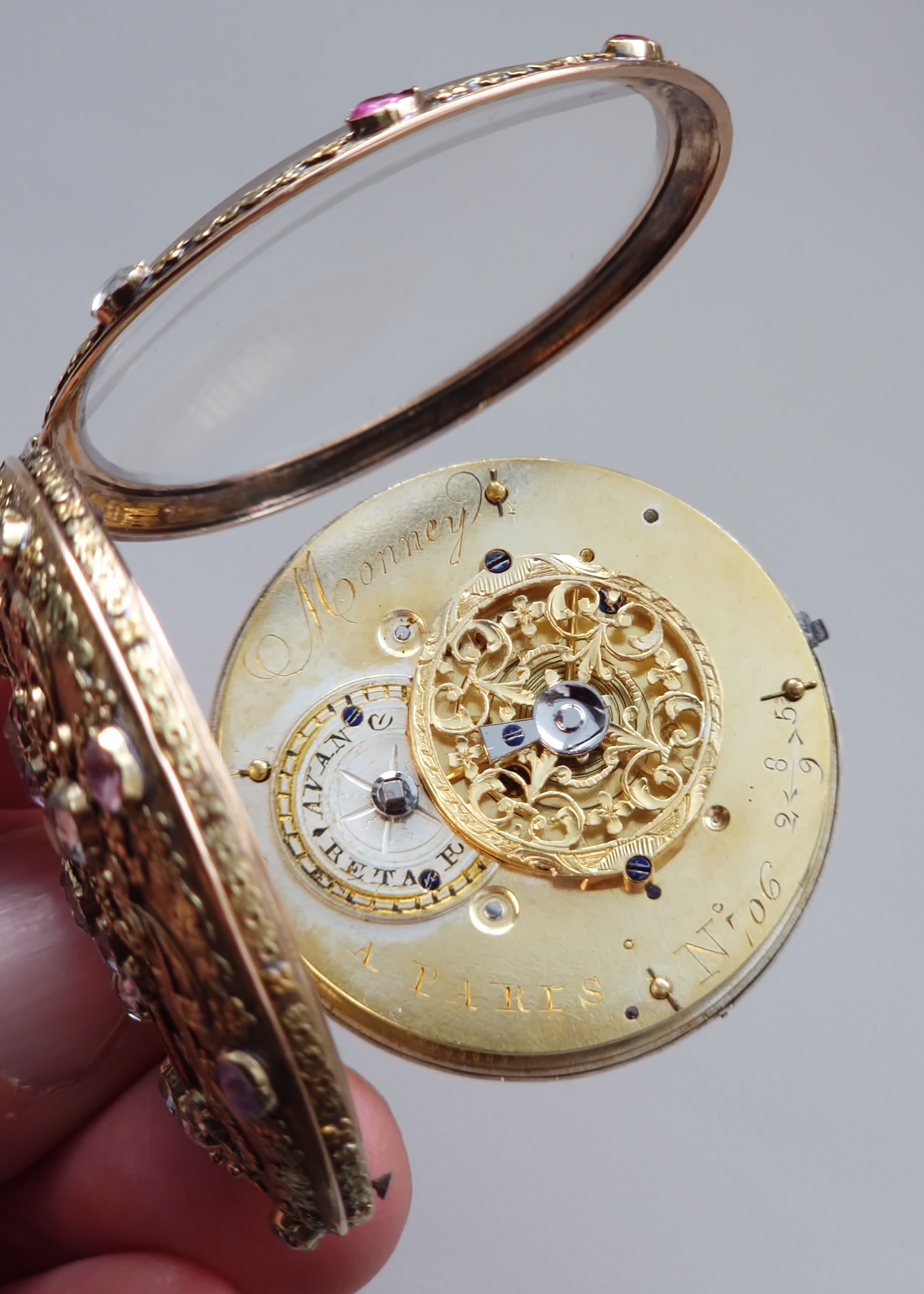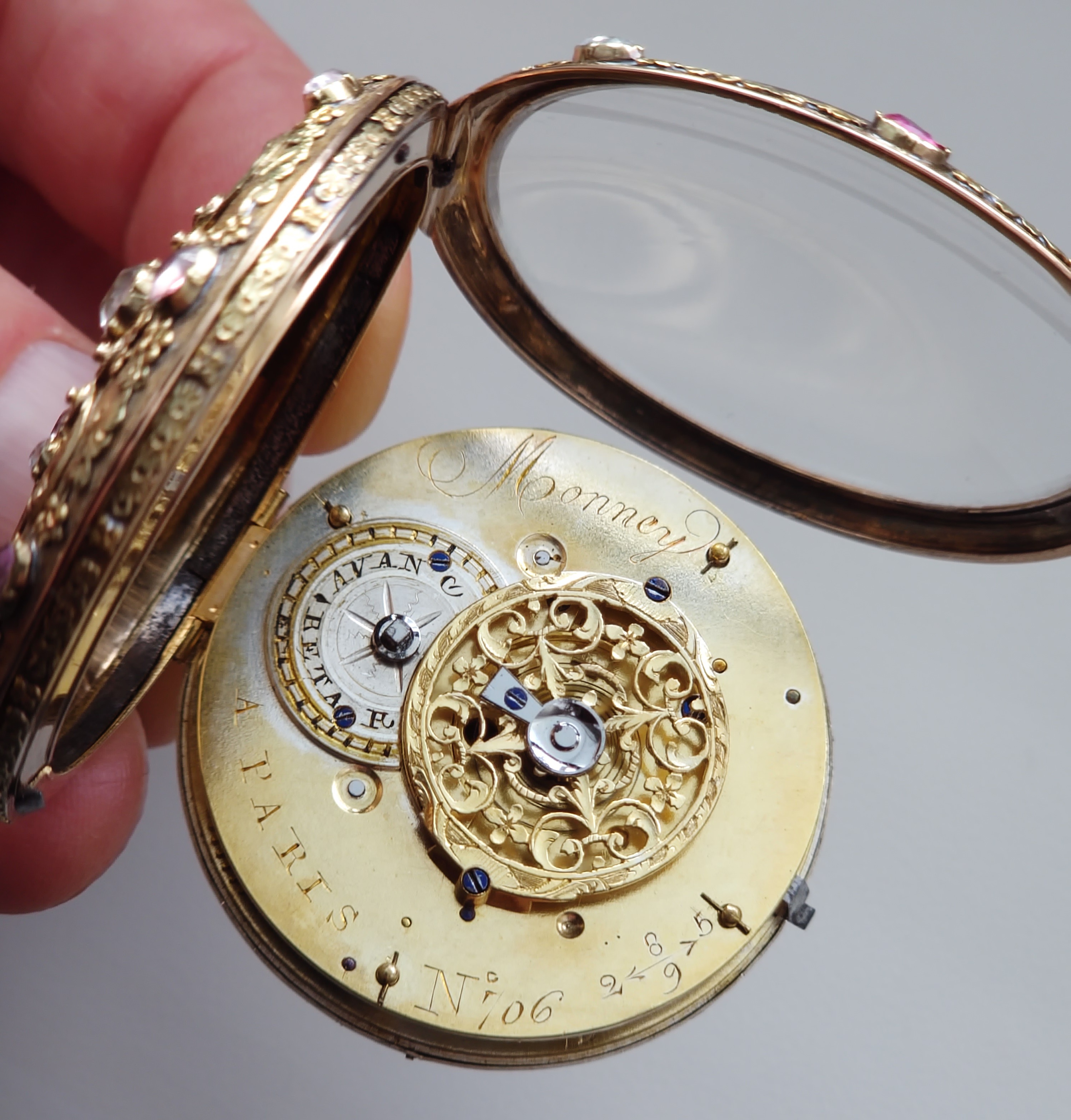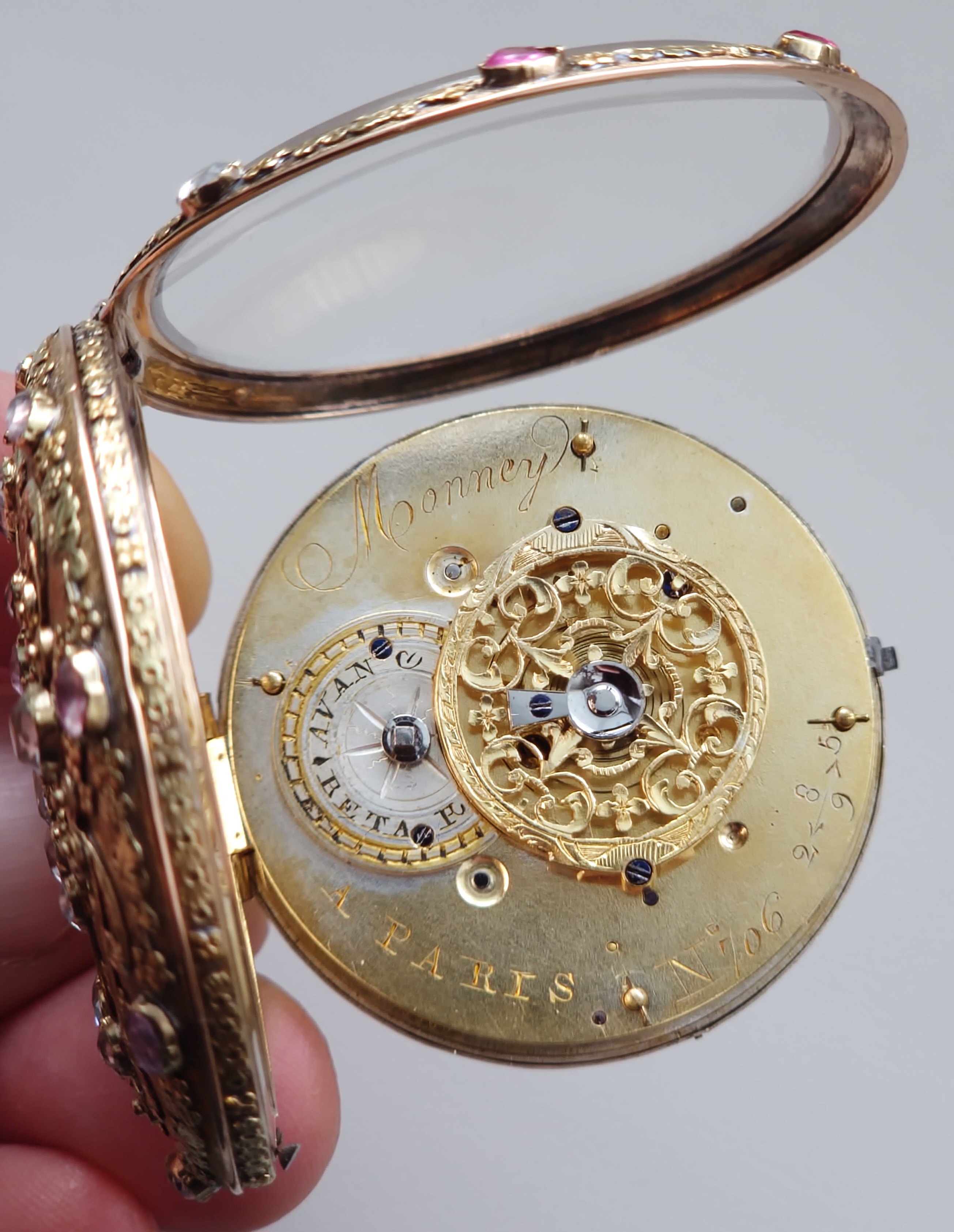Číslo 706 znamená kus, nebo číslo zakázky v rámci hodinářovi evidence. Vzácně provedené číslování 2589 se šipkami (šipky znamenají směr čtení) je montážní / párovací číslo pouzdra nebo zakázek zlatníka, nebo identifikace konkrétní série pouzder u zlatníka. Důkaz vzácné, zakázkové práce.