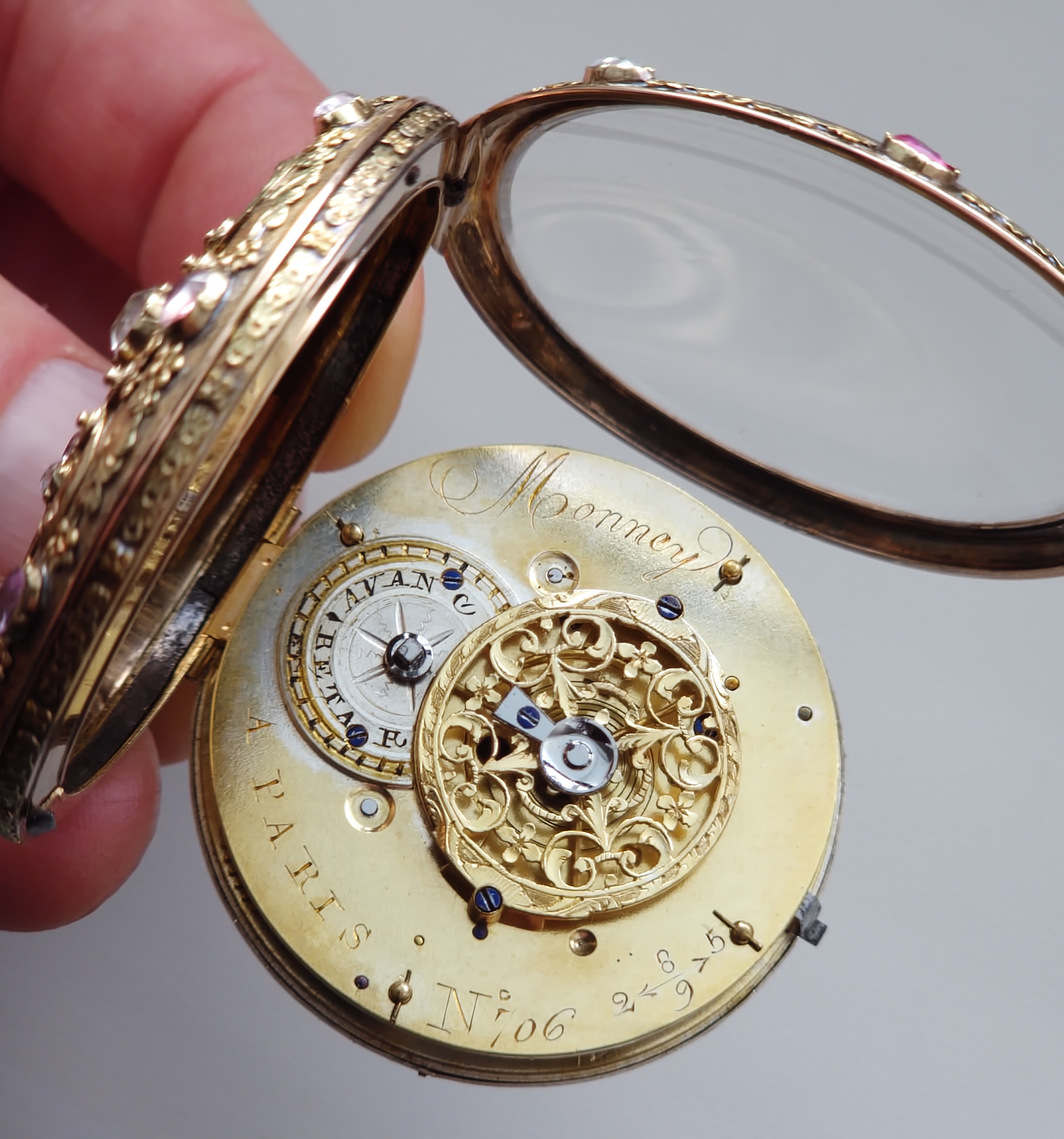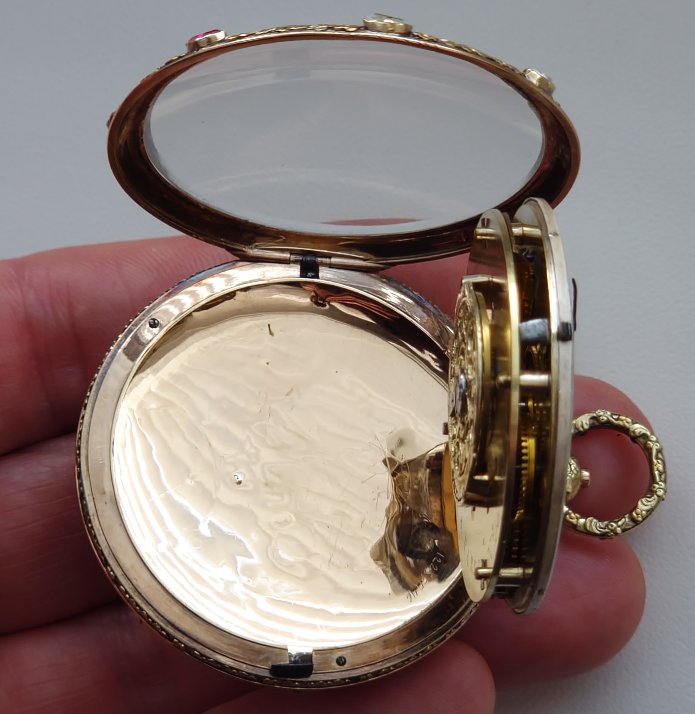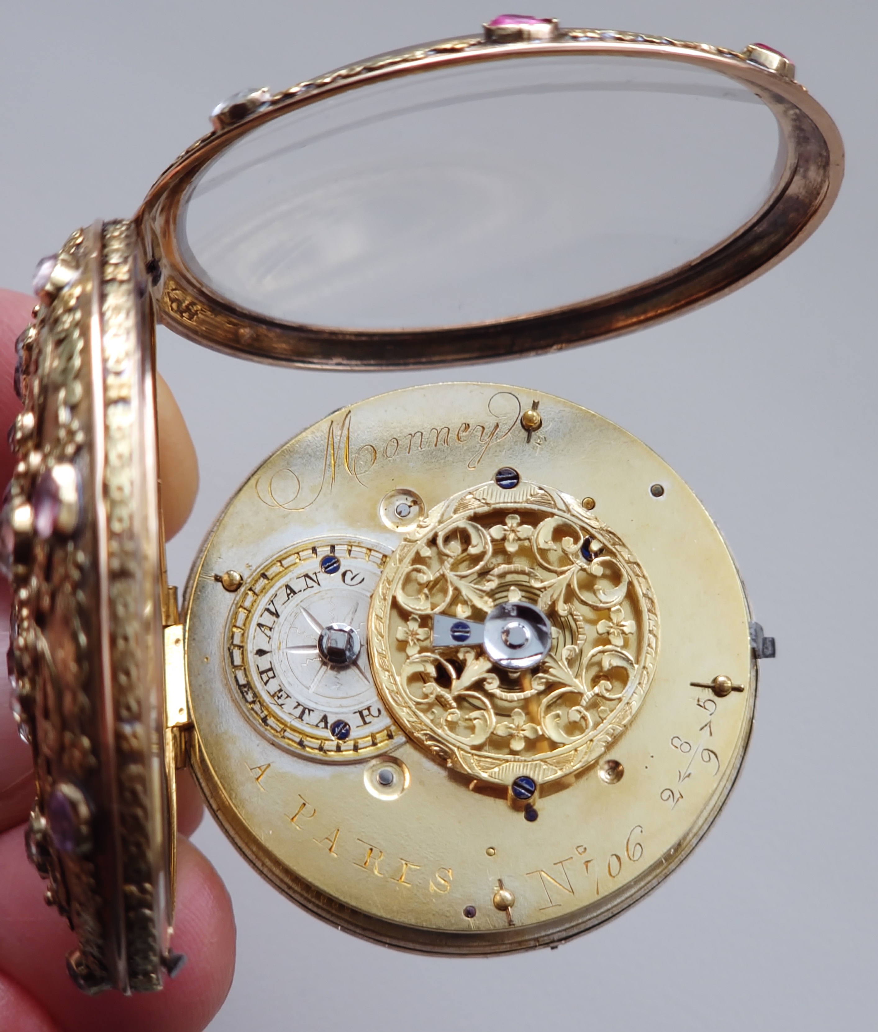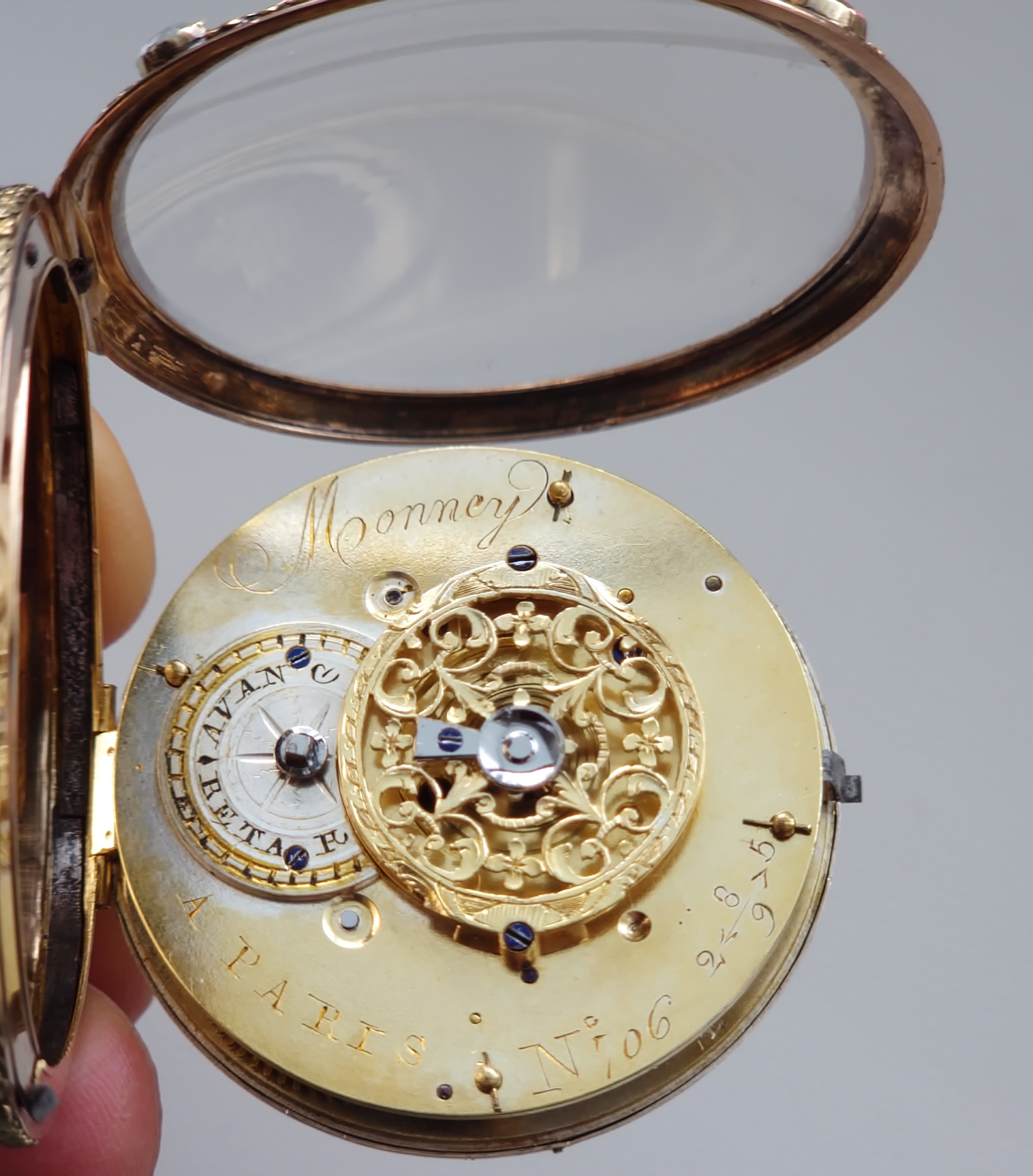 Číslo 706 znamená kus, nebo číslo zakázky v rámci hodinářovi evidence. Vzácně provedené číslování 2589 se šipkami (šipky znamenají směr čtení) je montážní / párovací číslo pouzdra nebo zakázek zlatníka, nebo identifikace konkrétní série pouzder u zlatníka. Důkaz vzácné, zakázkové práce.