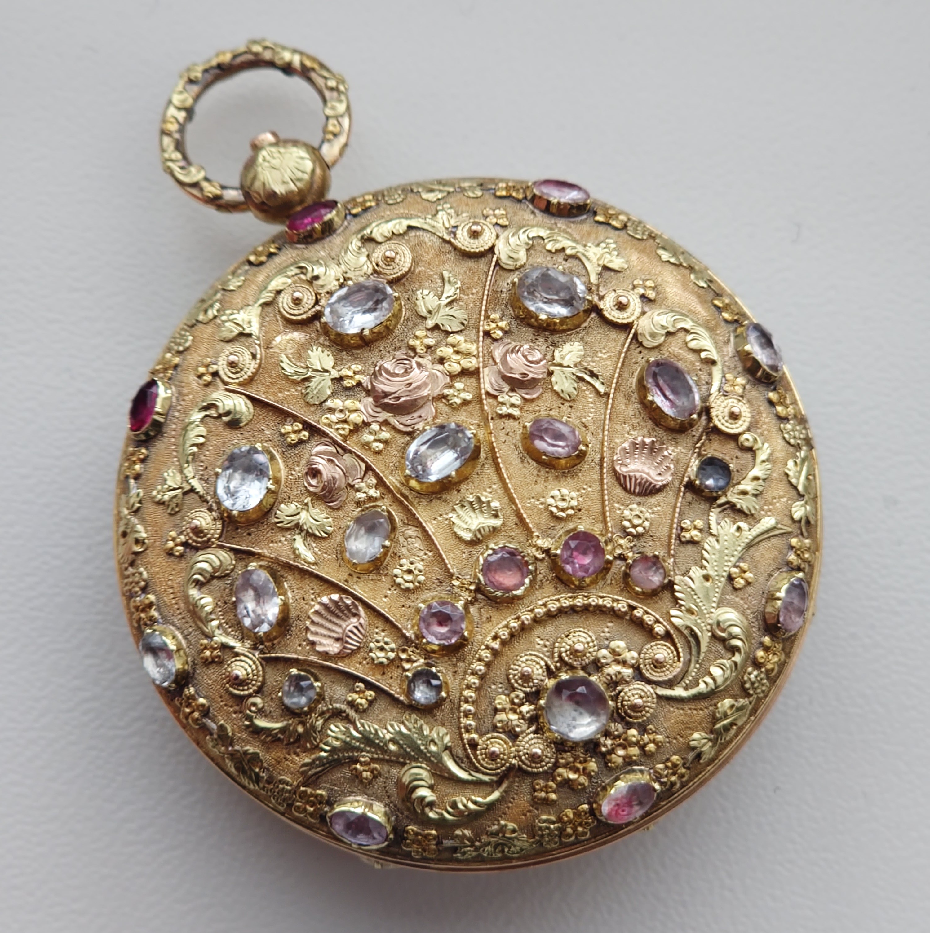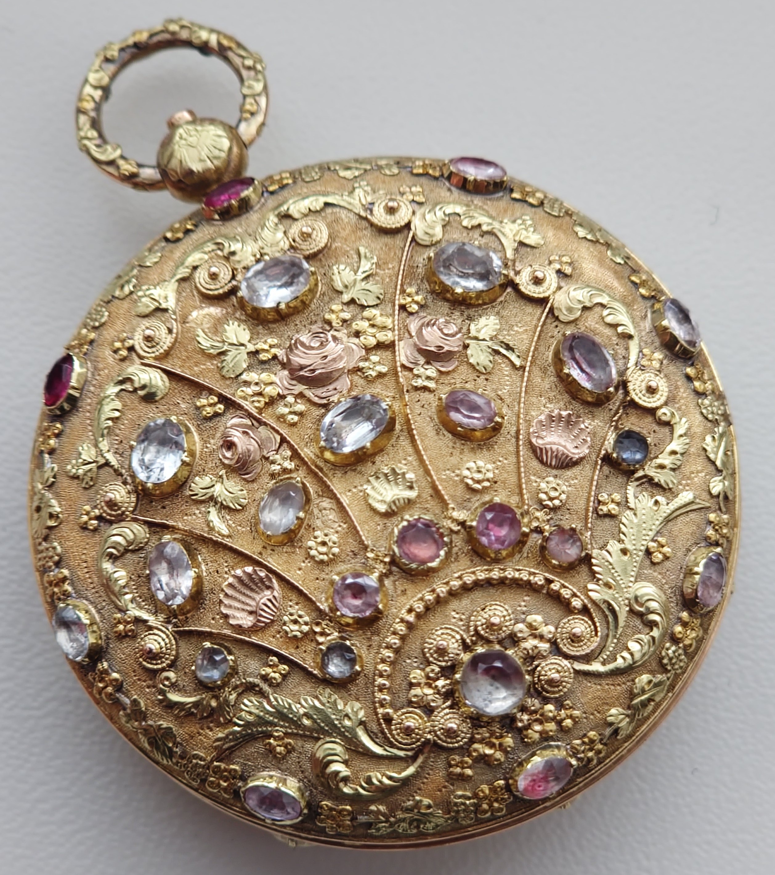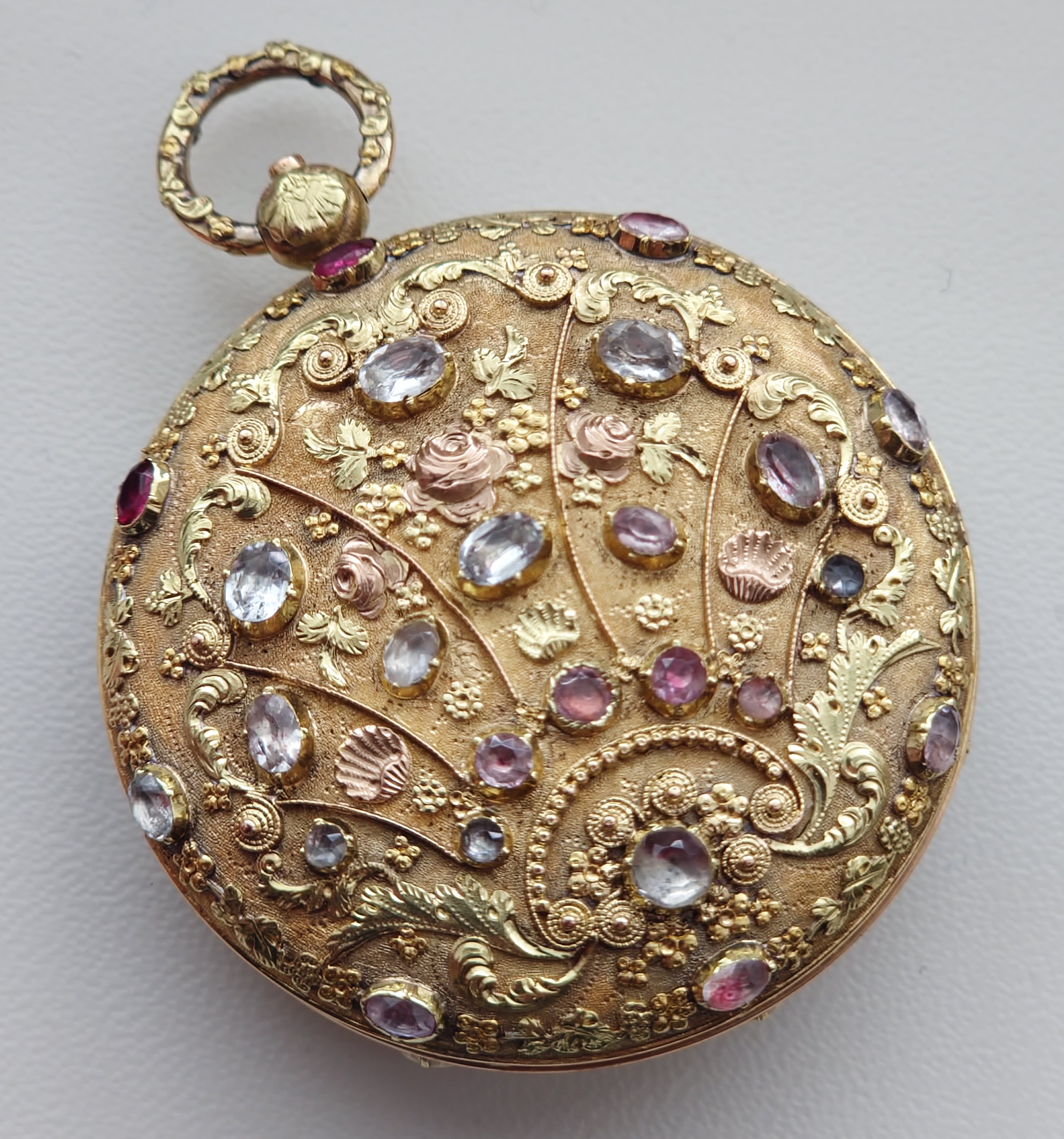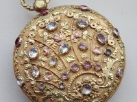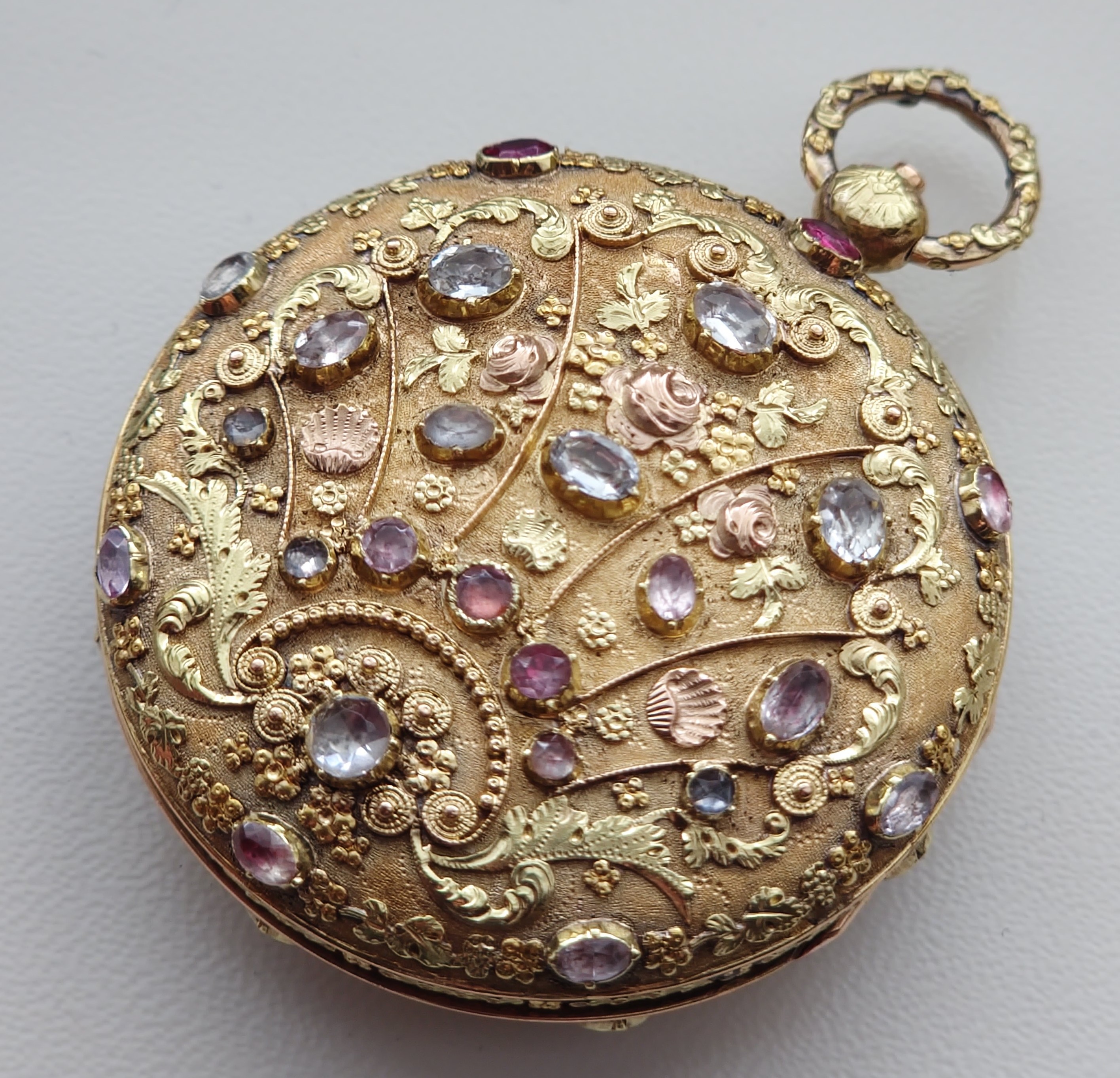 Pouzdro z dvoubarevného zlata, zdobené cizelováním, granulací a osazením kameny.