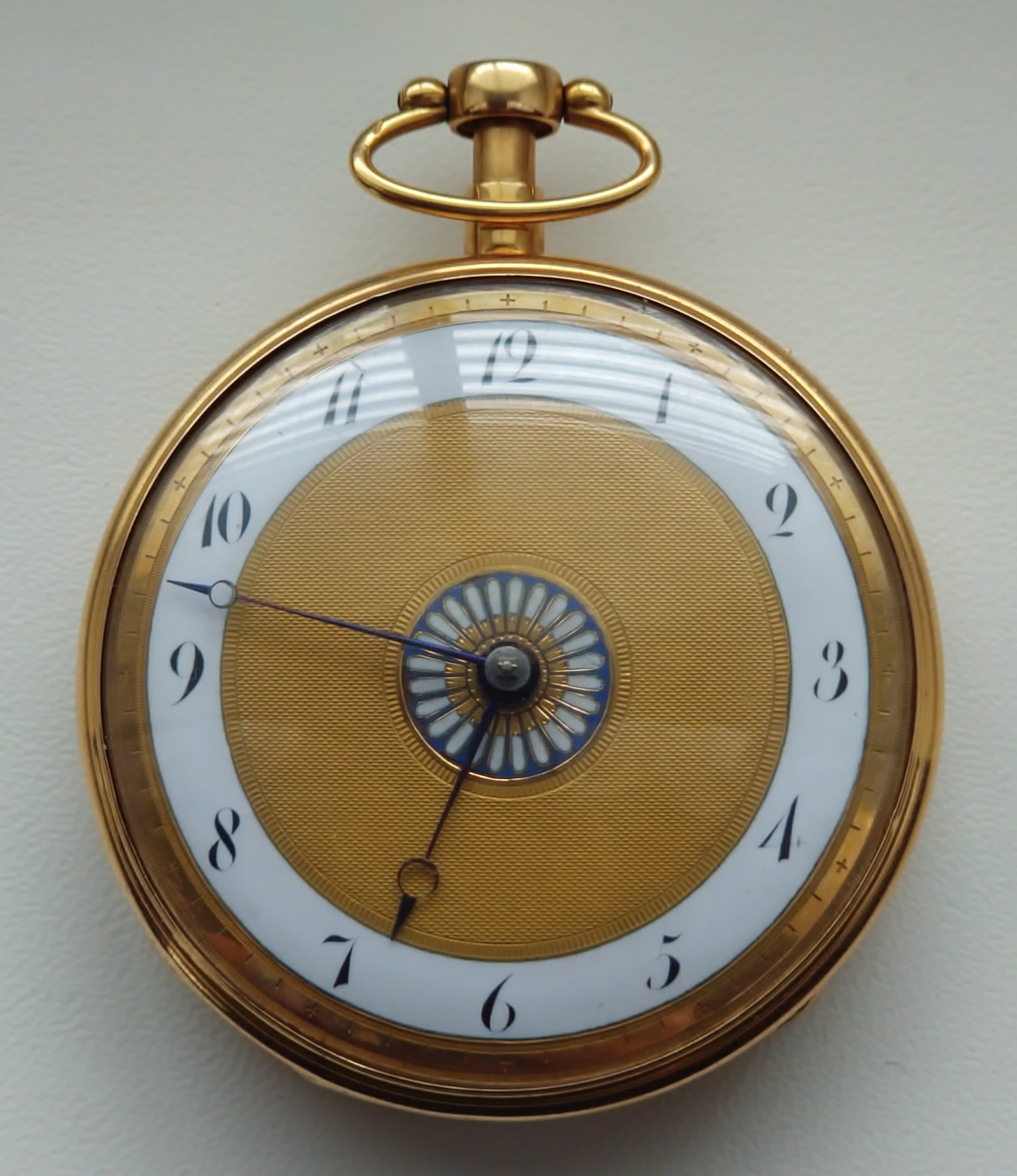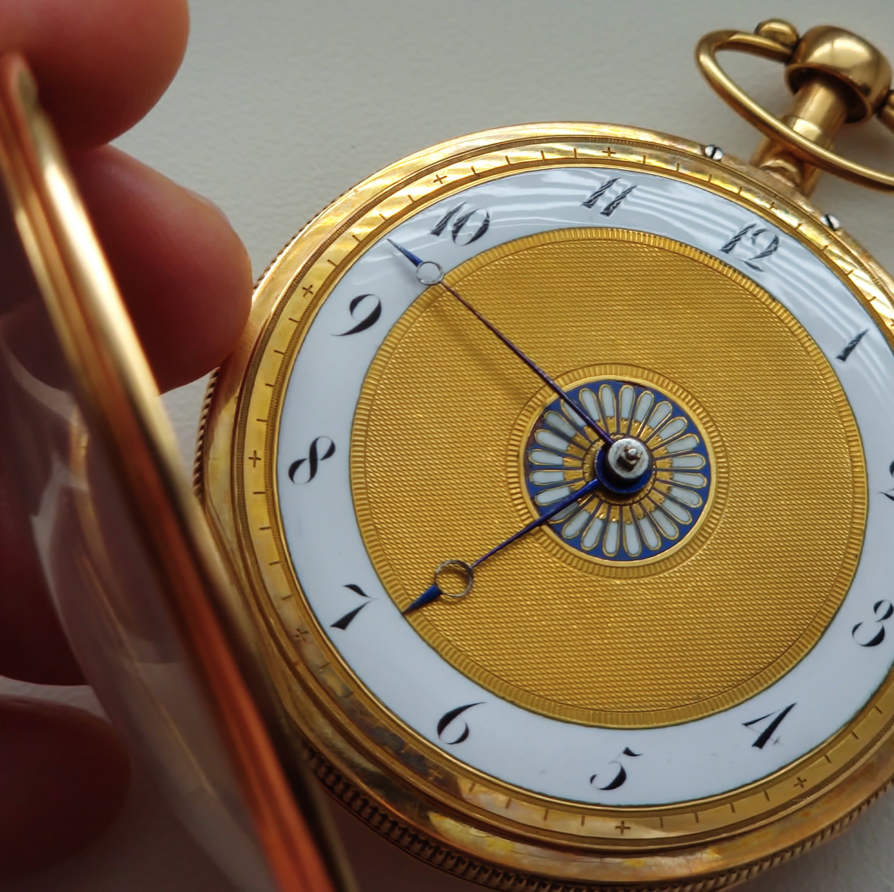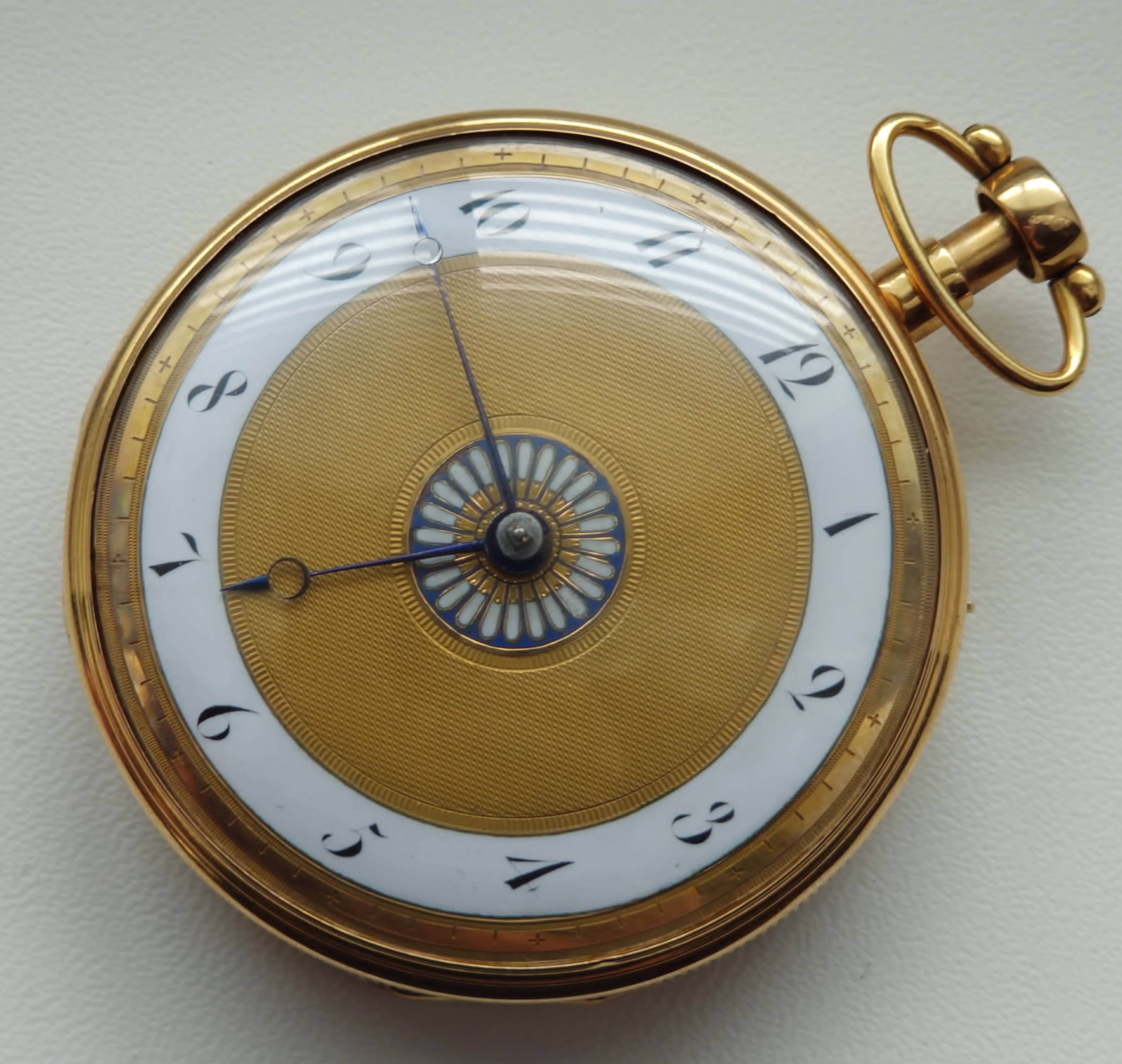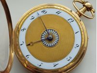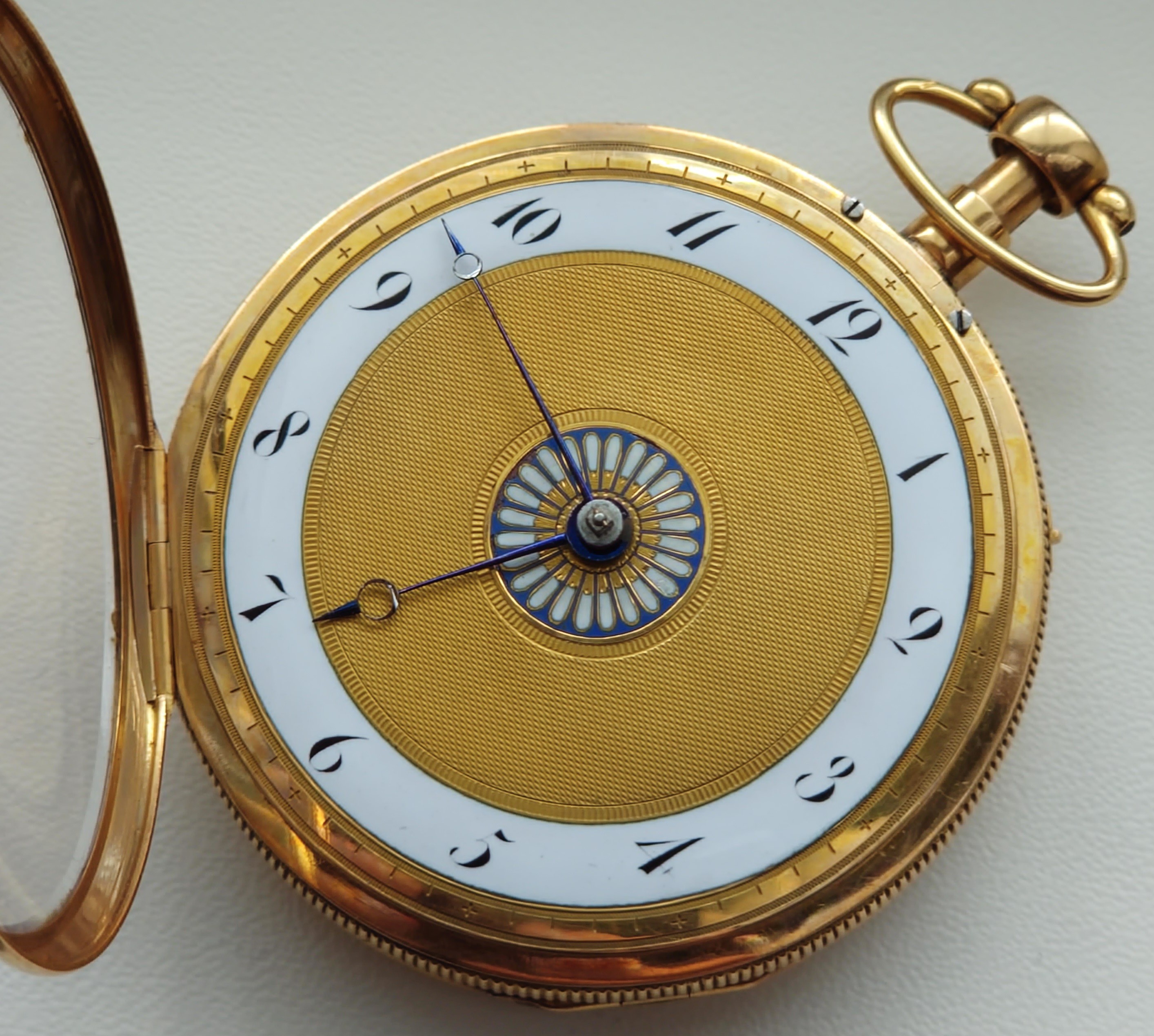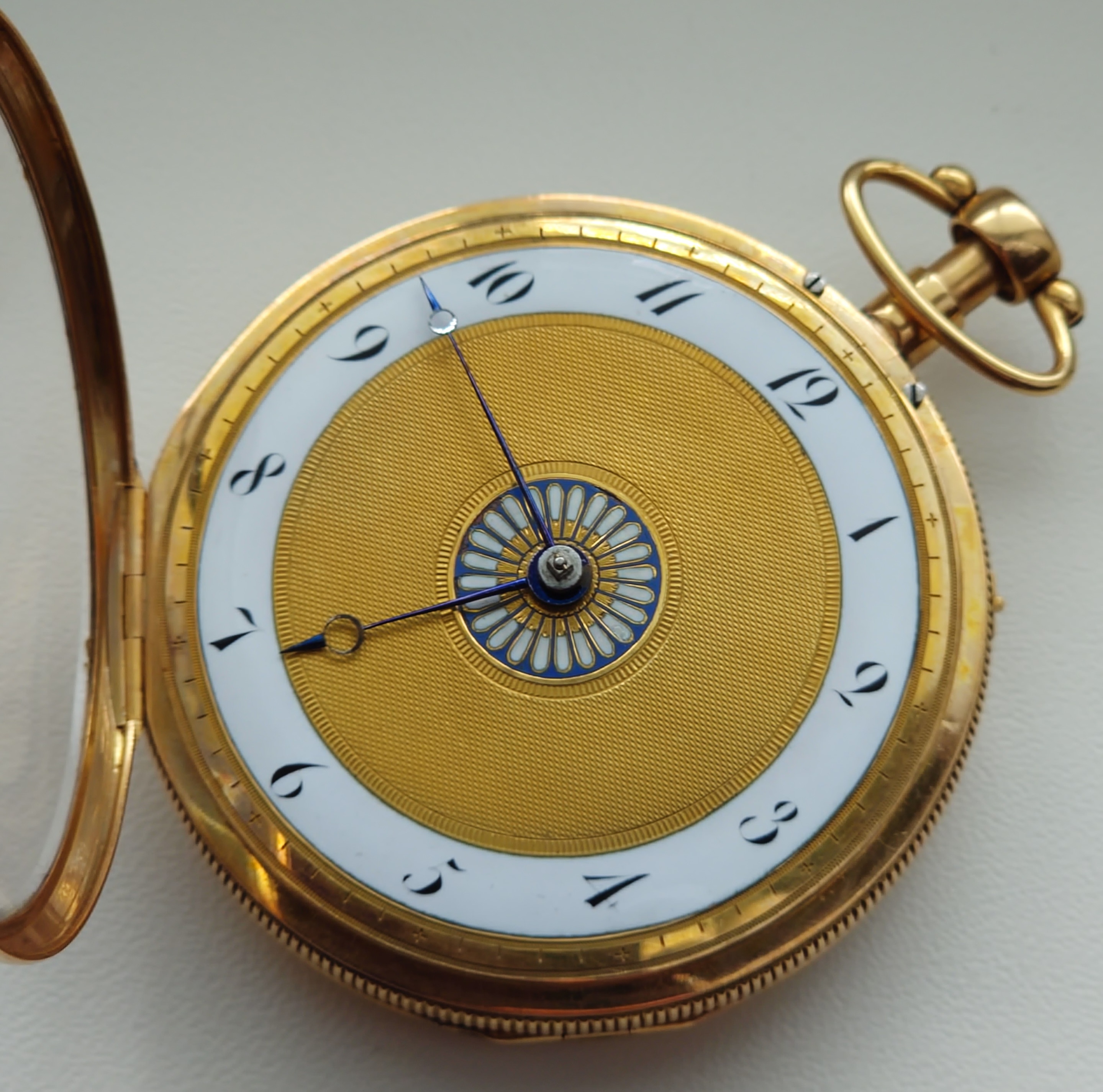 Masivní zlatý číselník, jeho provedení je na vysoké dílenské úrovni. Bílý, smaltovaný prstenec s arabskými číslicemi a rytou minutovou stupnicí po vnějším obvodu.
