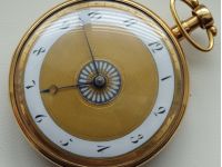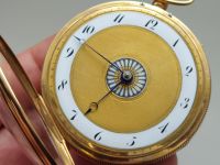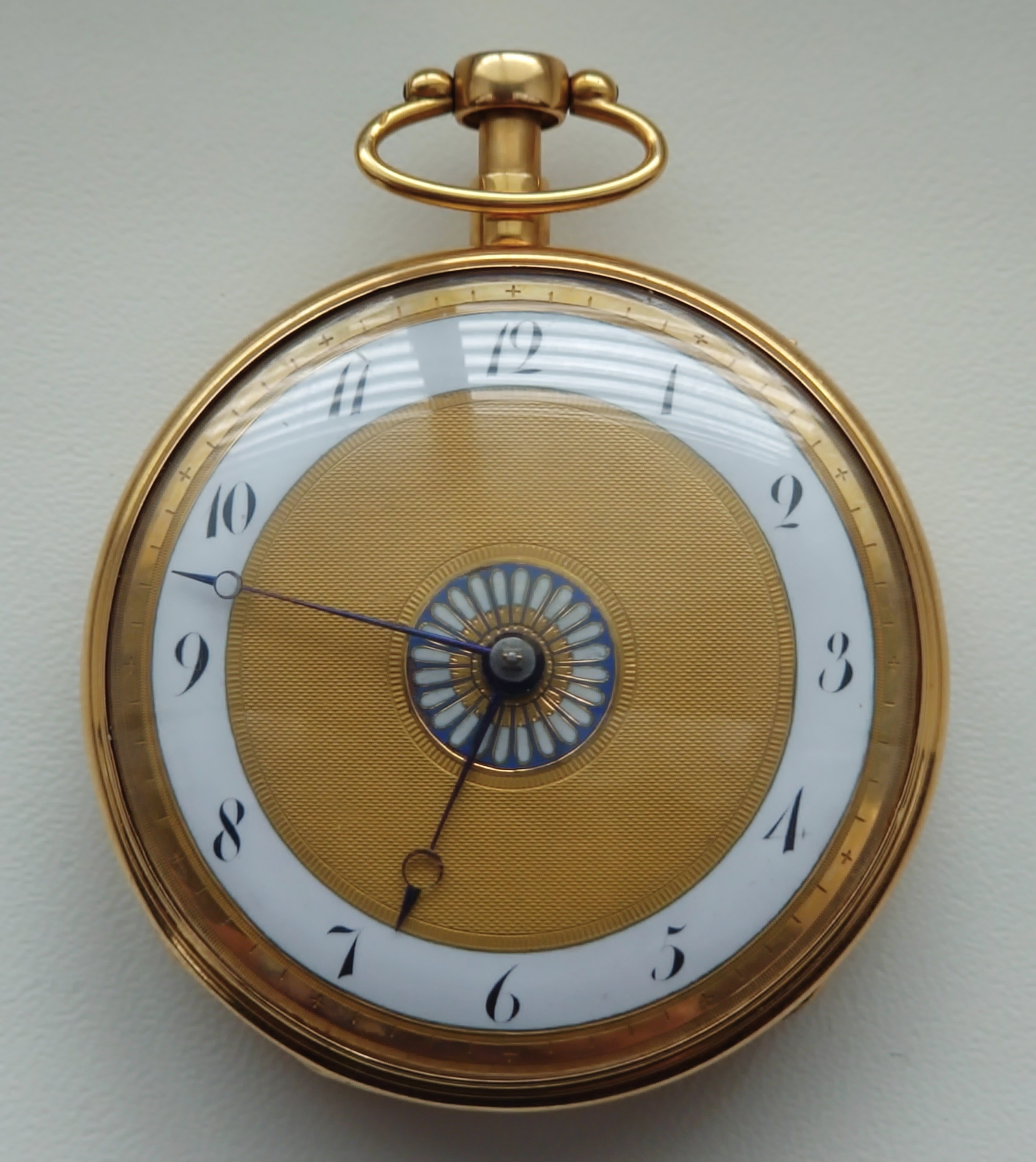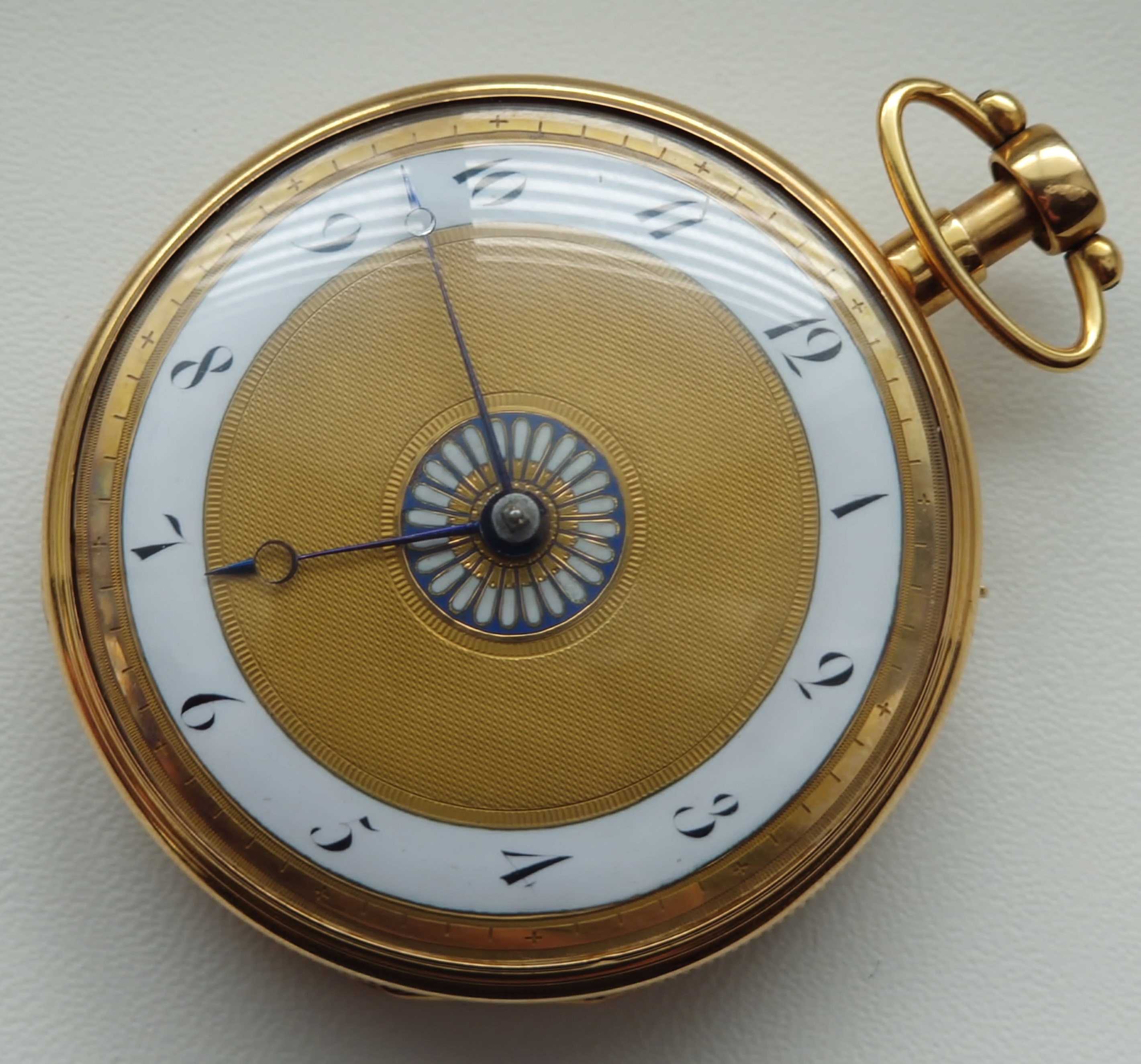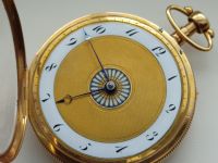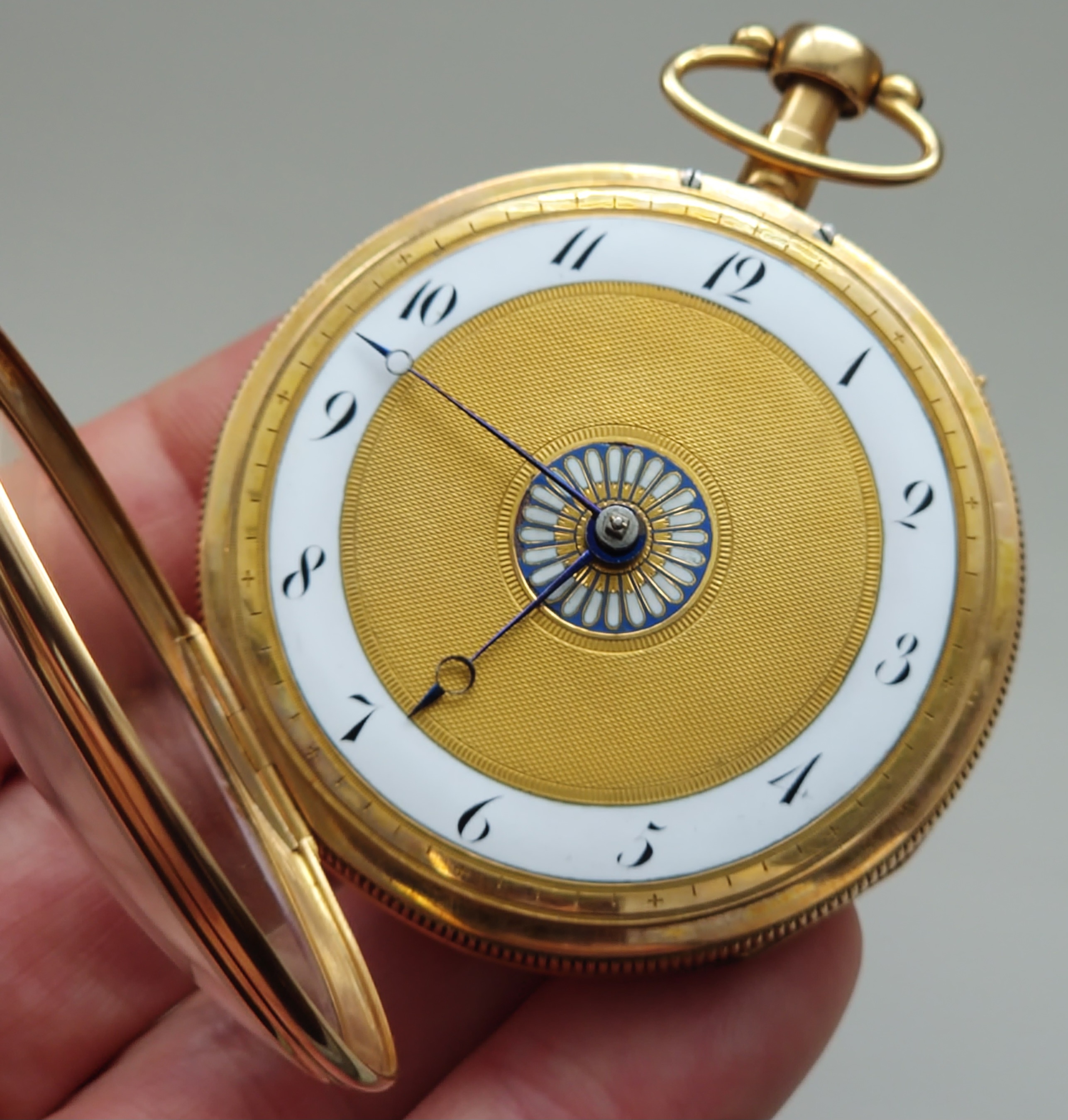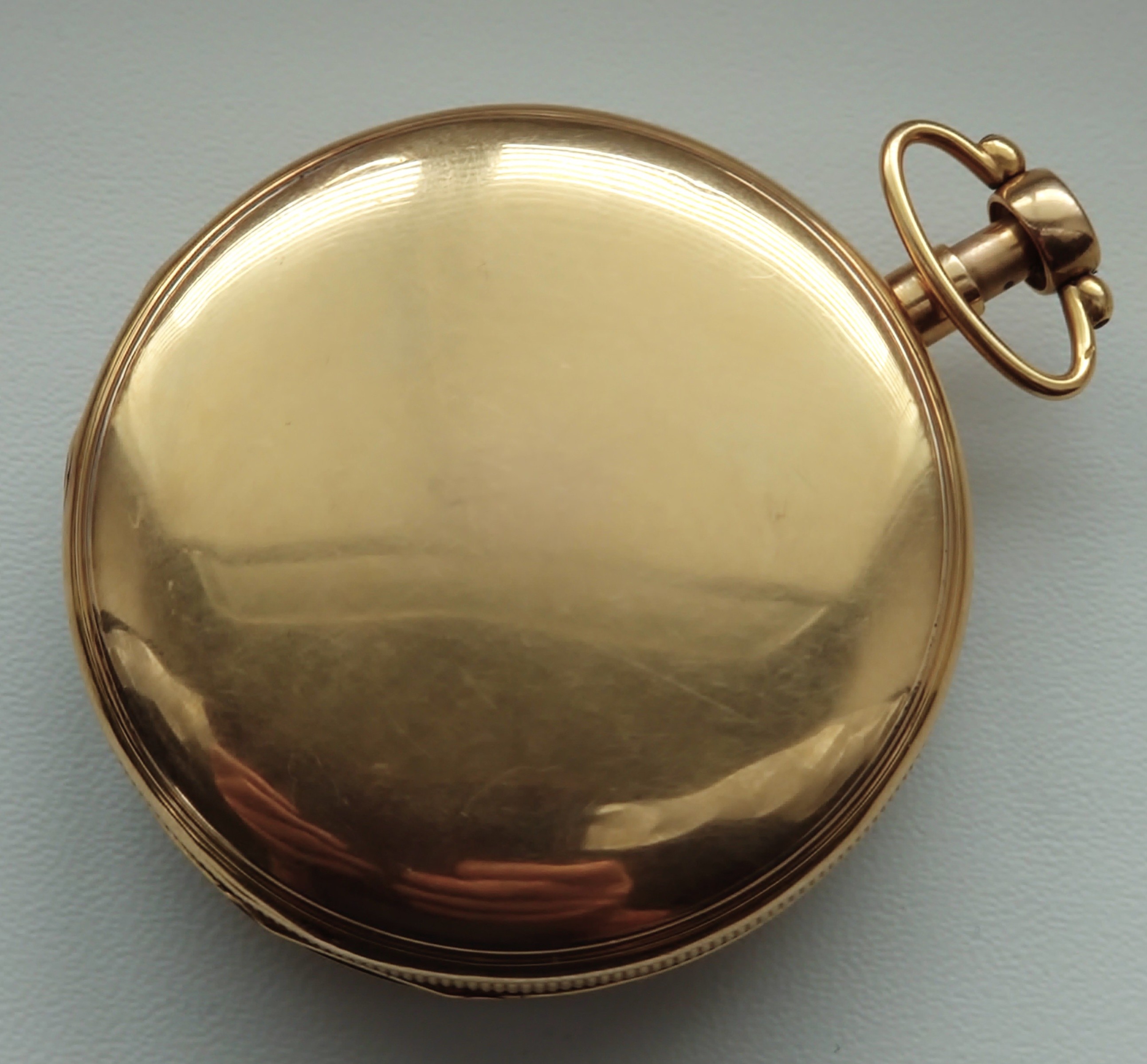 Masivní zlatý číselník, jeho provedení je na vysoké dílenské úrovni. Bílý, smaltovaný prstenec s arabskými číslicemi a rytou minutovou stupnicí po vnějším obvodu.