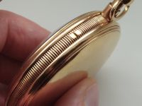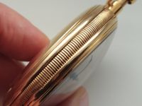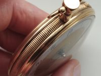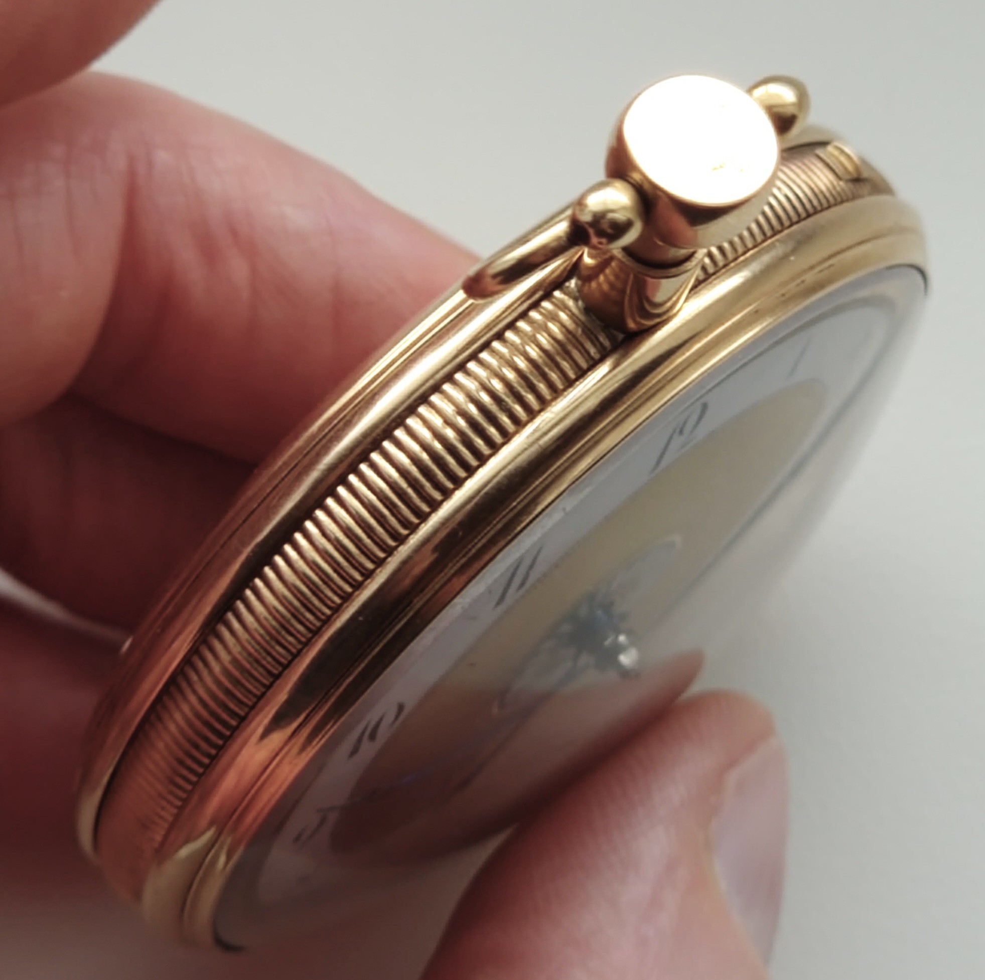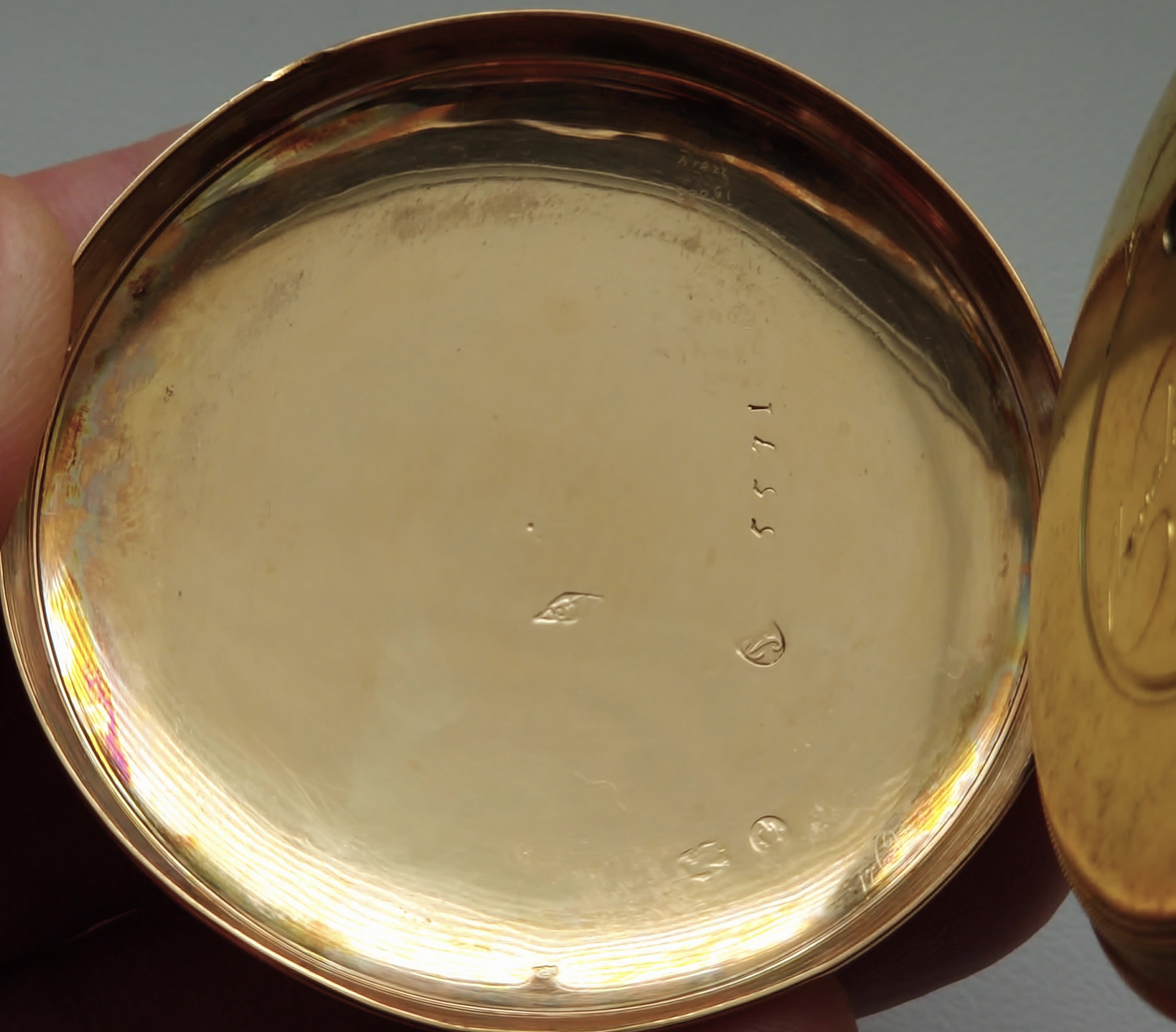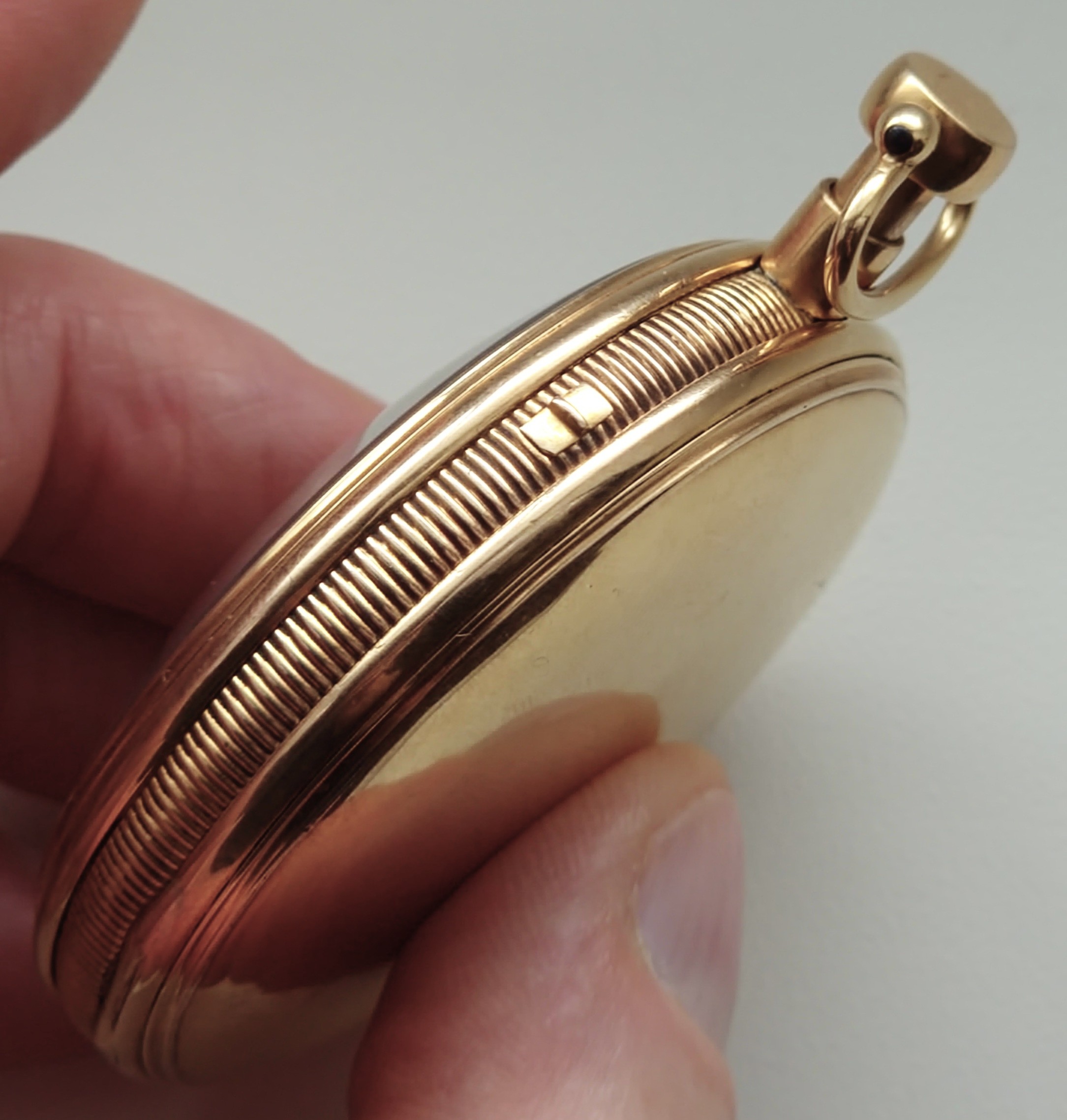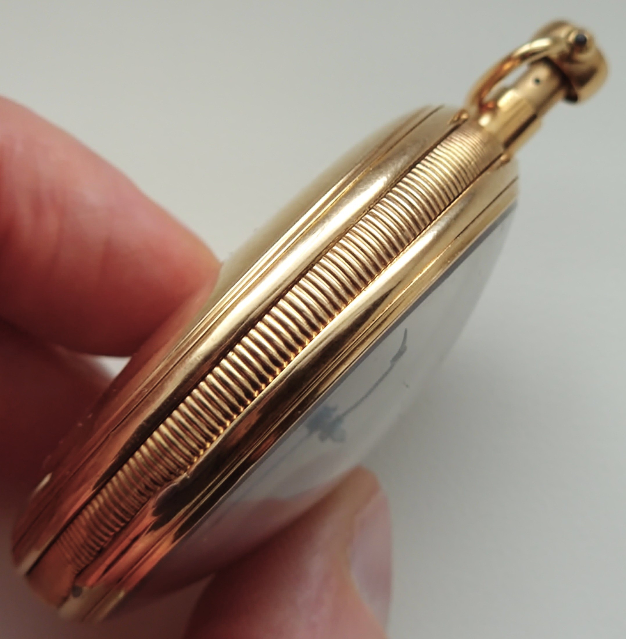Masivní a těžké zlaté pouzdro je puncované, číslované a značené výrobcem. Je velmi zachovalé, nepoškozené a bez důlků. Obvodové rádlování boku pouzdra. Po zavření vše pevně drží a lícuje.