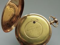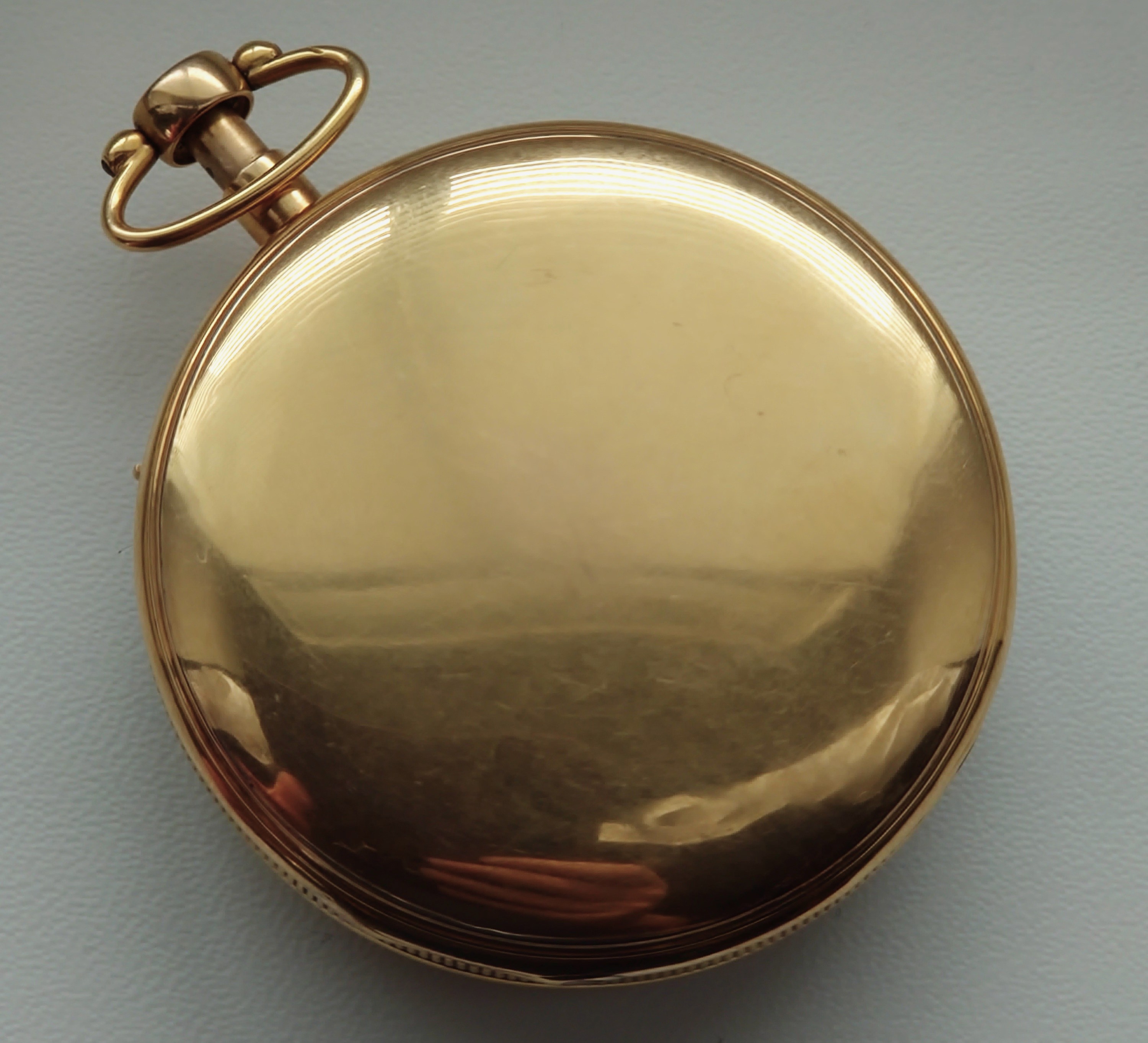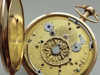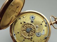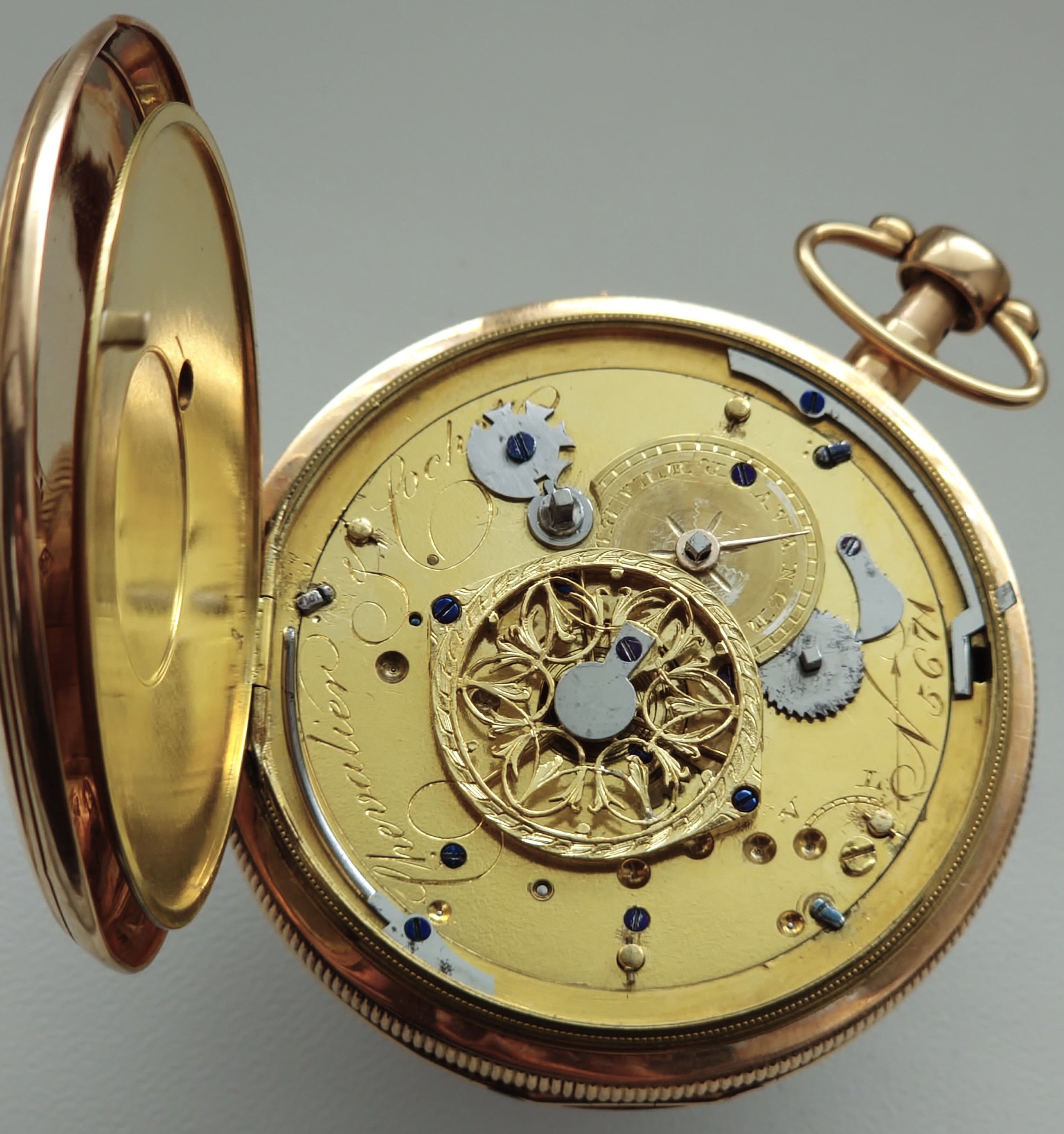 Stroj je shodně signovaný s prachovým víkem. Špindl krok. Čtvrťové dvojhlasné bití do spirál. Modře brynýrované šrouby. Číselník regulátoru přesnosti chodu s ručičkou. Pěkně prořezávaný můstek setrvačky. Šnekový, řetízkový silový kompenzátor tahu pera. Vše plně funkční a spolehlivě jdoucí. Věnec setrvačky kmitá pravidelně, ve velké amplitudě a ve všech polohách.