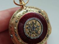 Pouzdro je bohatě zdobené plastickým květinovým dekorem, doplněným kamenným osazením. Zadní víko zdobí červený transparentní smalt na gilošovaném podkladu s motivem slunečních paprsků, který efektně pracuje se světlem. Smalt je původní, bez poškození a bez známek oprav.
